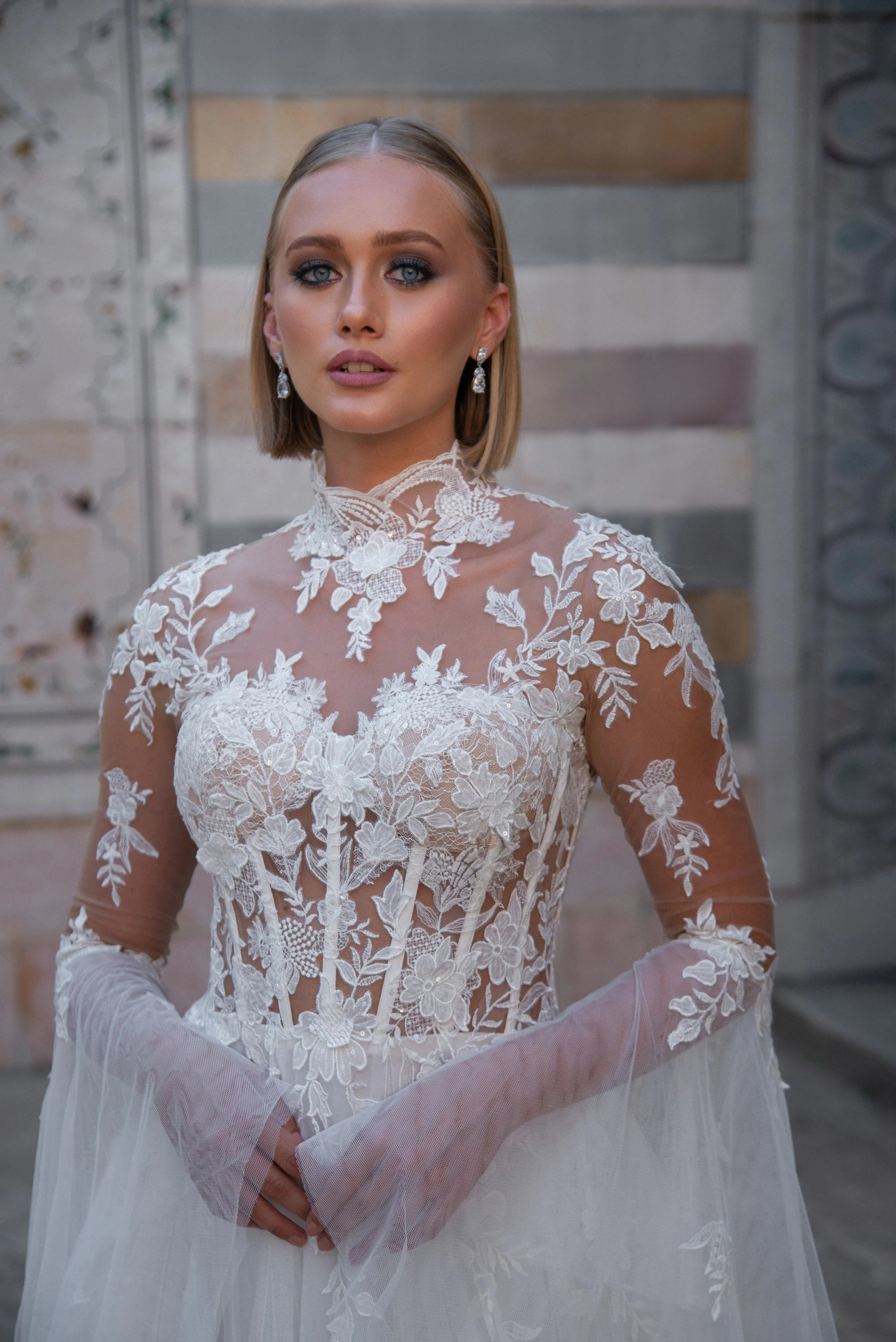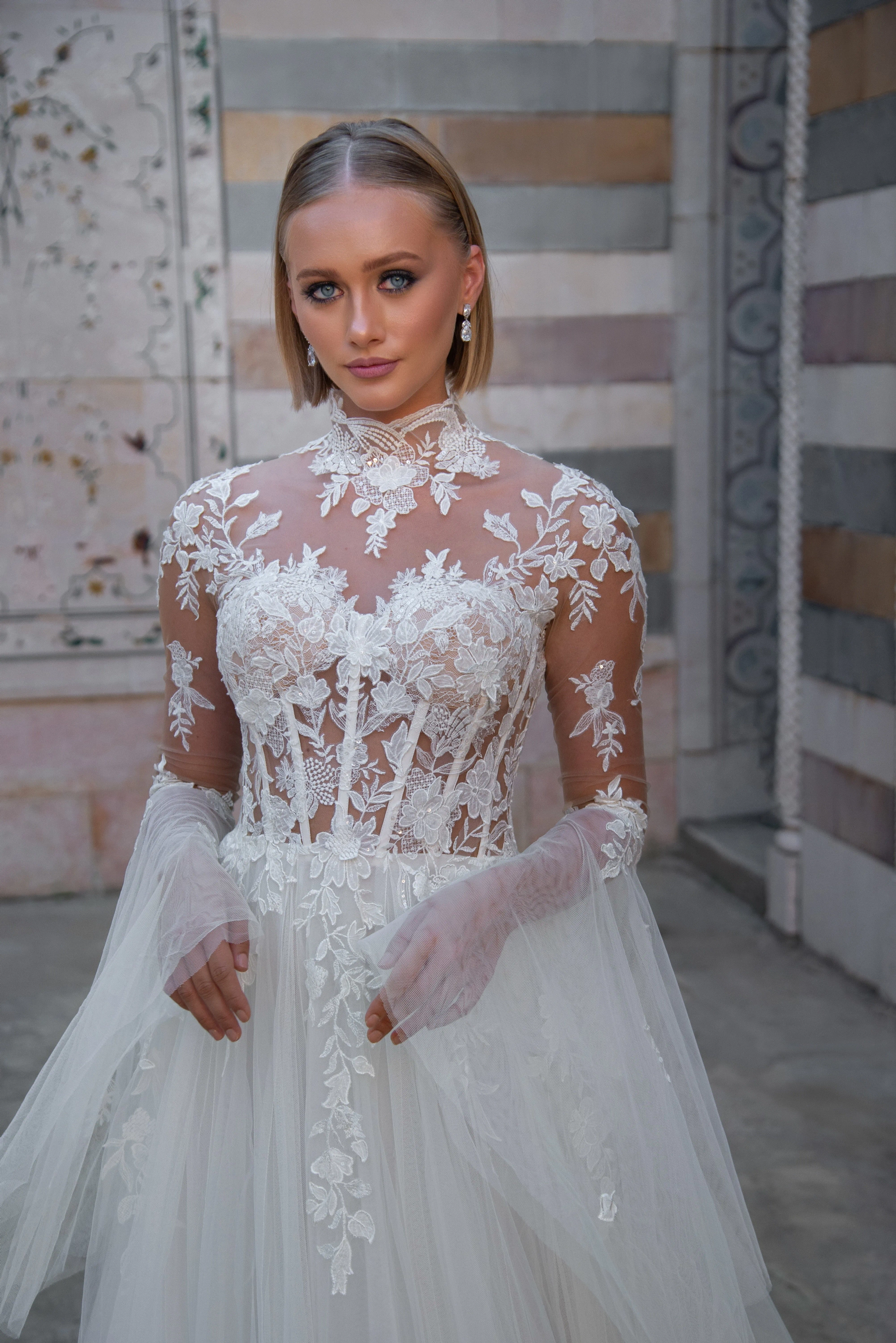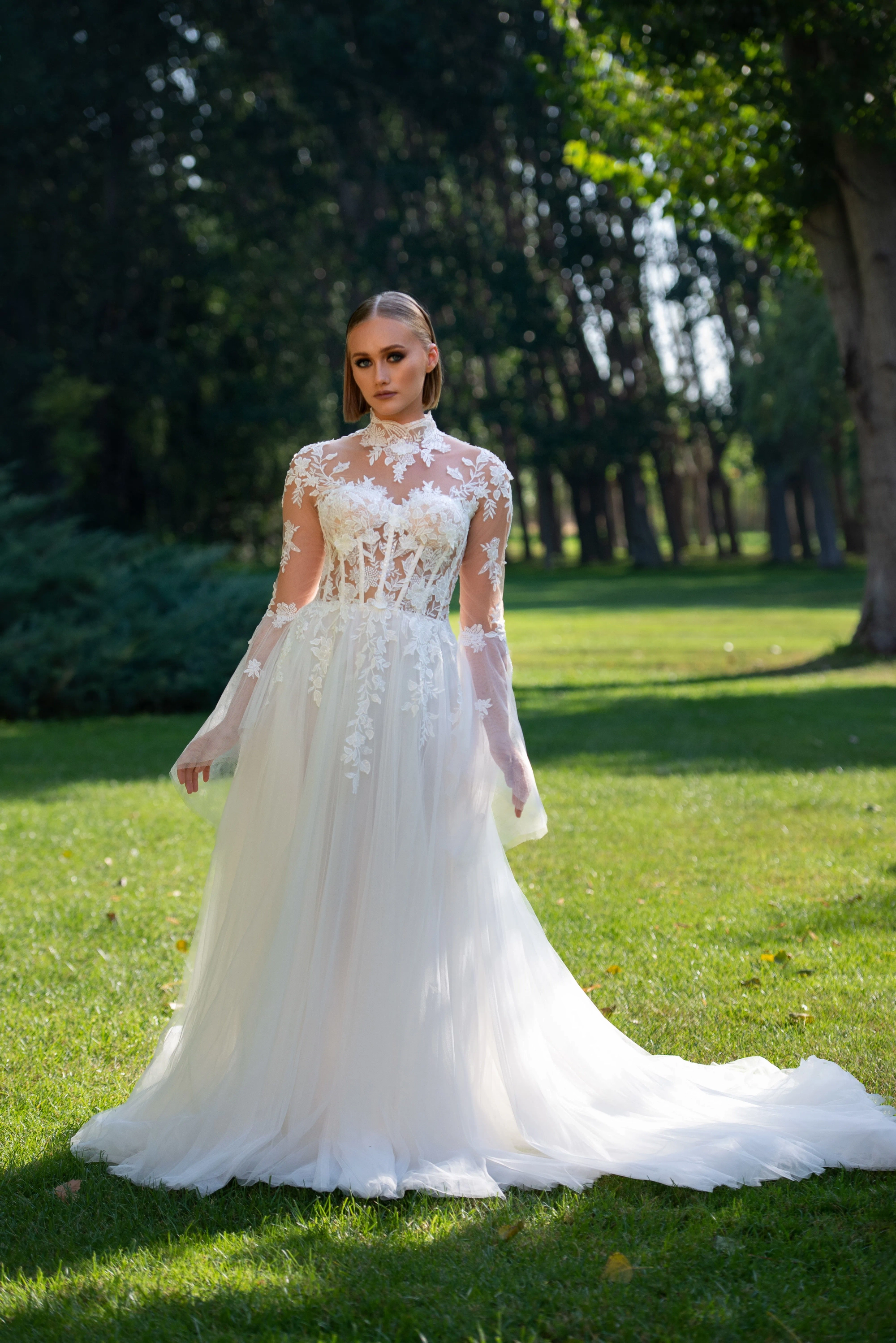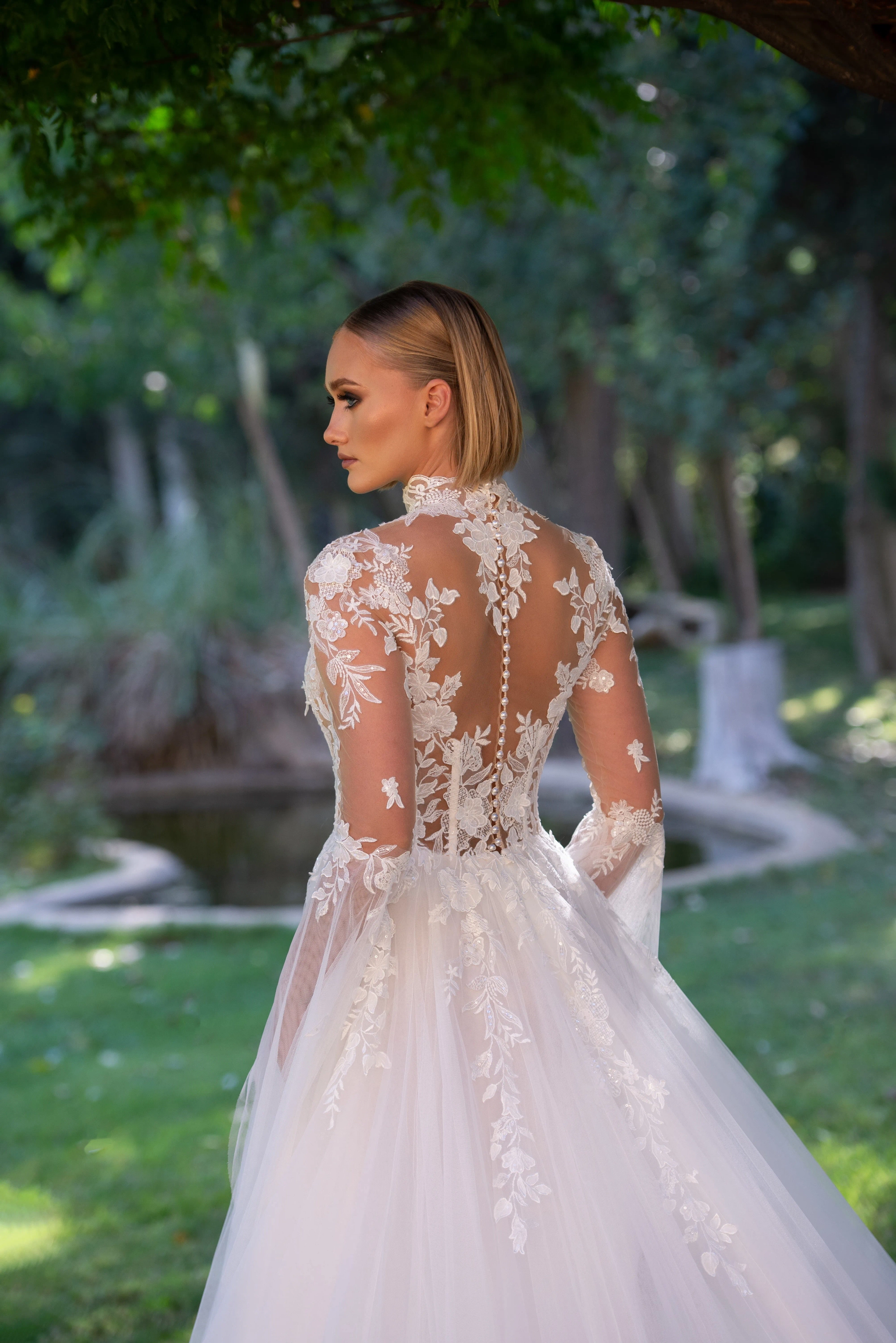 Celebrate your everlasting love in the Evianna! Inspired by the icon, Grace Kelly, Evianna stuns with her soft, romantic details. The floral and vine appliquéd bodice is divinely feminine. The lush appliqué frames the shoulders and collar gracefully. The open illusion back with buttons is what bridal dreams are made of. One of the most magical details of Evianna are the bell sleeves, that are dreamy and light-catching. Add magic to your day wearing the beautiful Evianna.