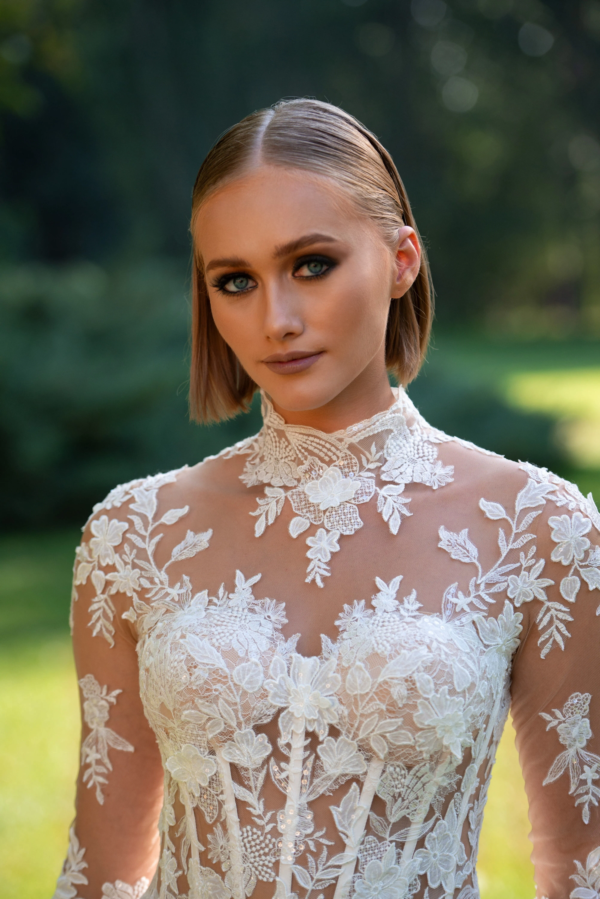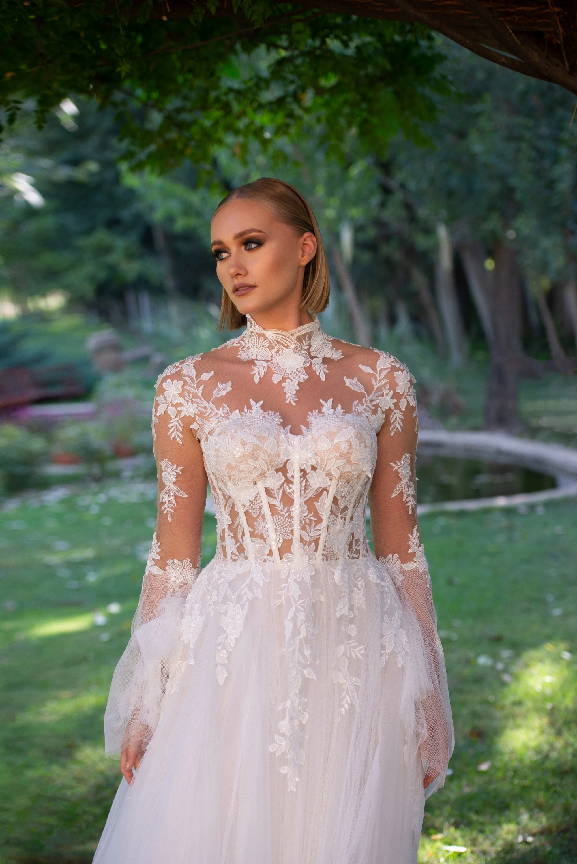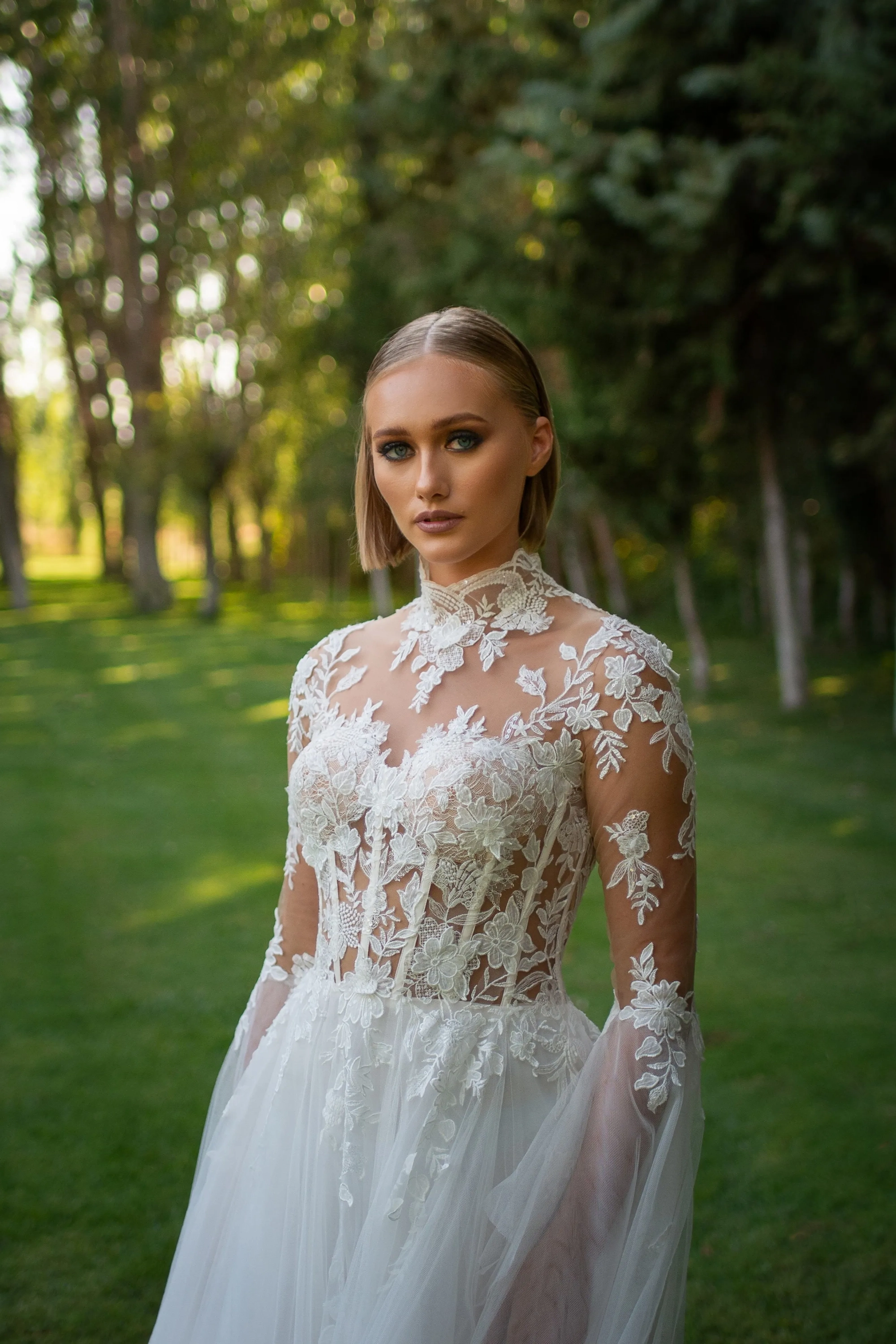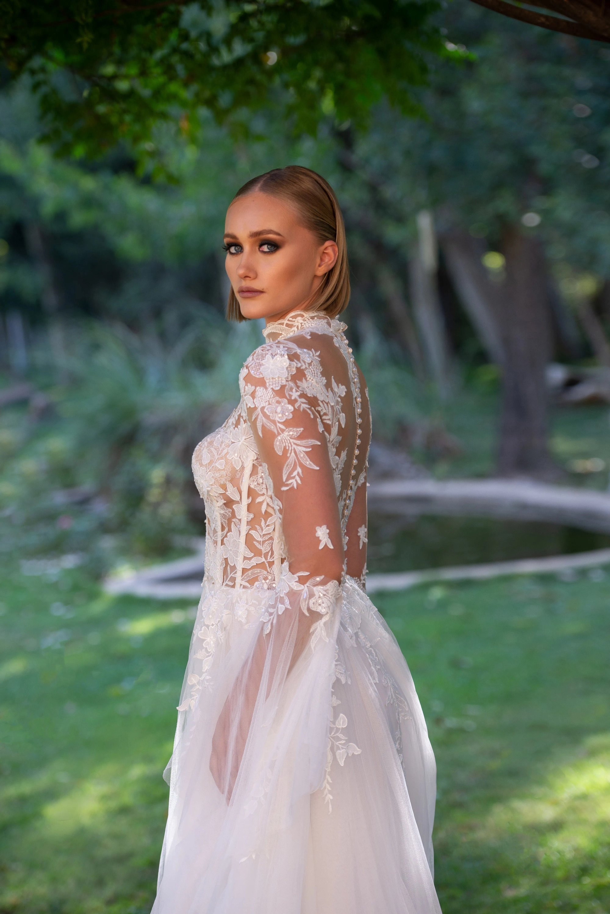 Celebrate your everlasting love in the Evianna! Inspired by the icon, Grace Kelly, Evianna stuns with her soft, romantic details. The floral and vine appliquéd bodice is divinely feminine. The lush appliqué frames the shoulders and collar gracefully. The open illusion back with buttons is what bridal dreams are made of. One of the most magical details of Evianna are the bell sleeves, that are dreamy and light-catching. Add magic to your day wearing the beautiful Evianna.