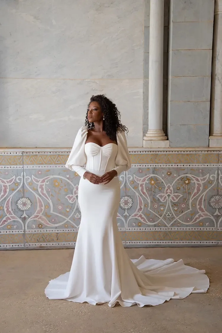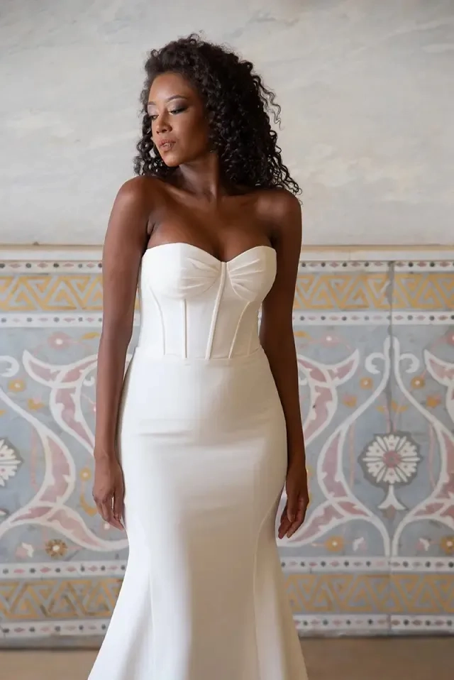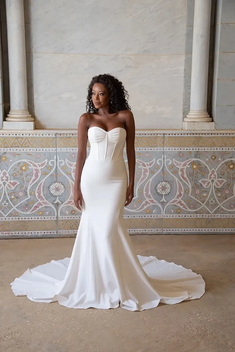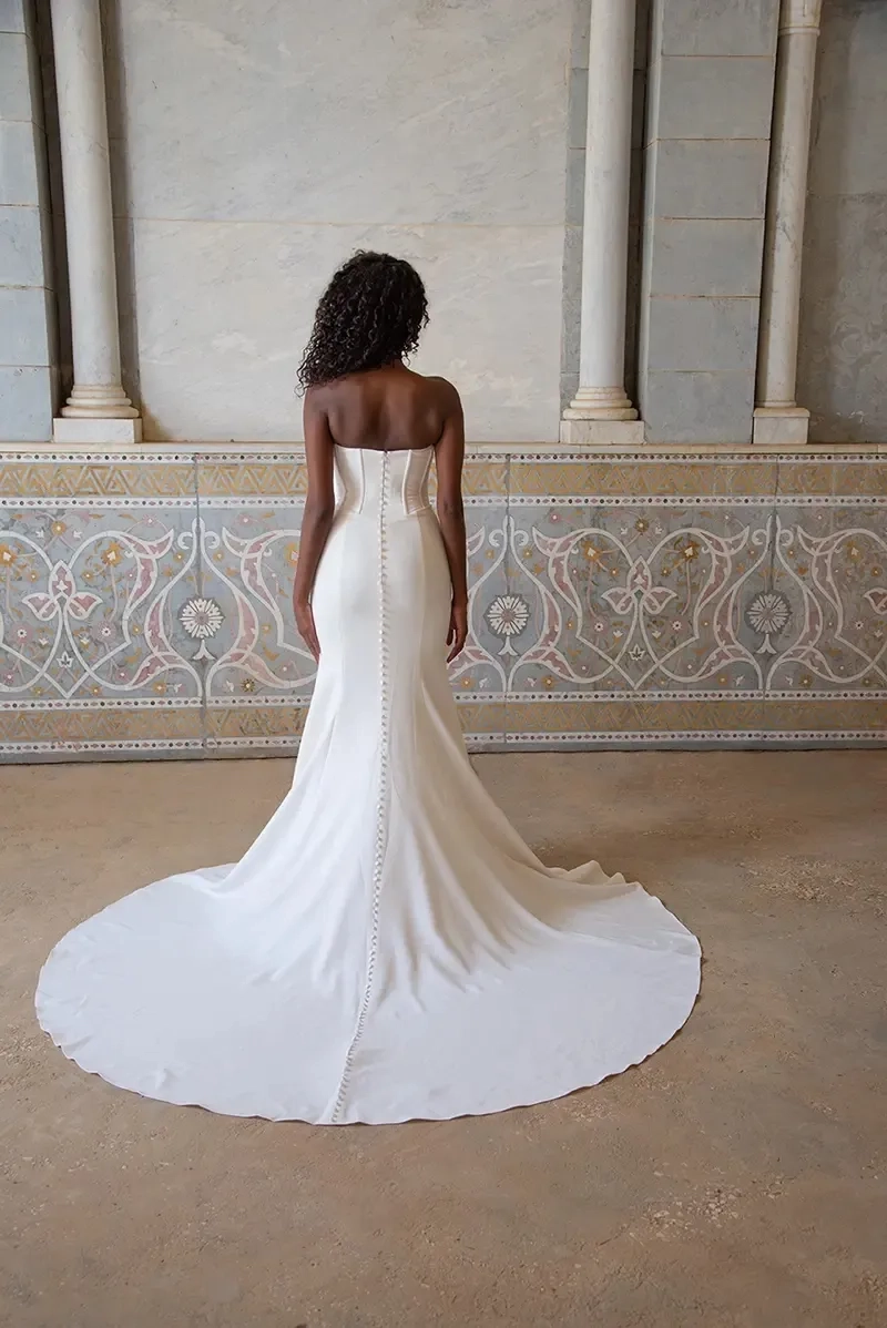 Bows are a girl’s best friend. Beaux captures bridal chic style with a pleated bow-inspired detail on the bodice – Audrey Hepburn approved! This fitted, strapless gown has exposed matte (ivory-on-ivory) corset boning that highlights the silhouette while feeling subtle and beautifully understated. The jersey stretch skirt is form-fitting yet allows for stretch and comfortability. The buttons all the way down the back into the chapel length train adds classic character. Feel effortlessly chic in Beaux!
