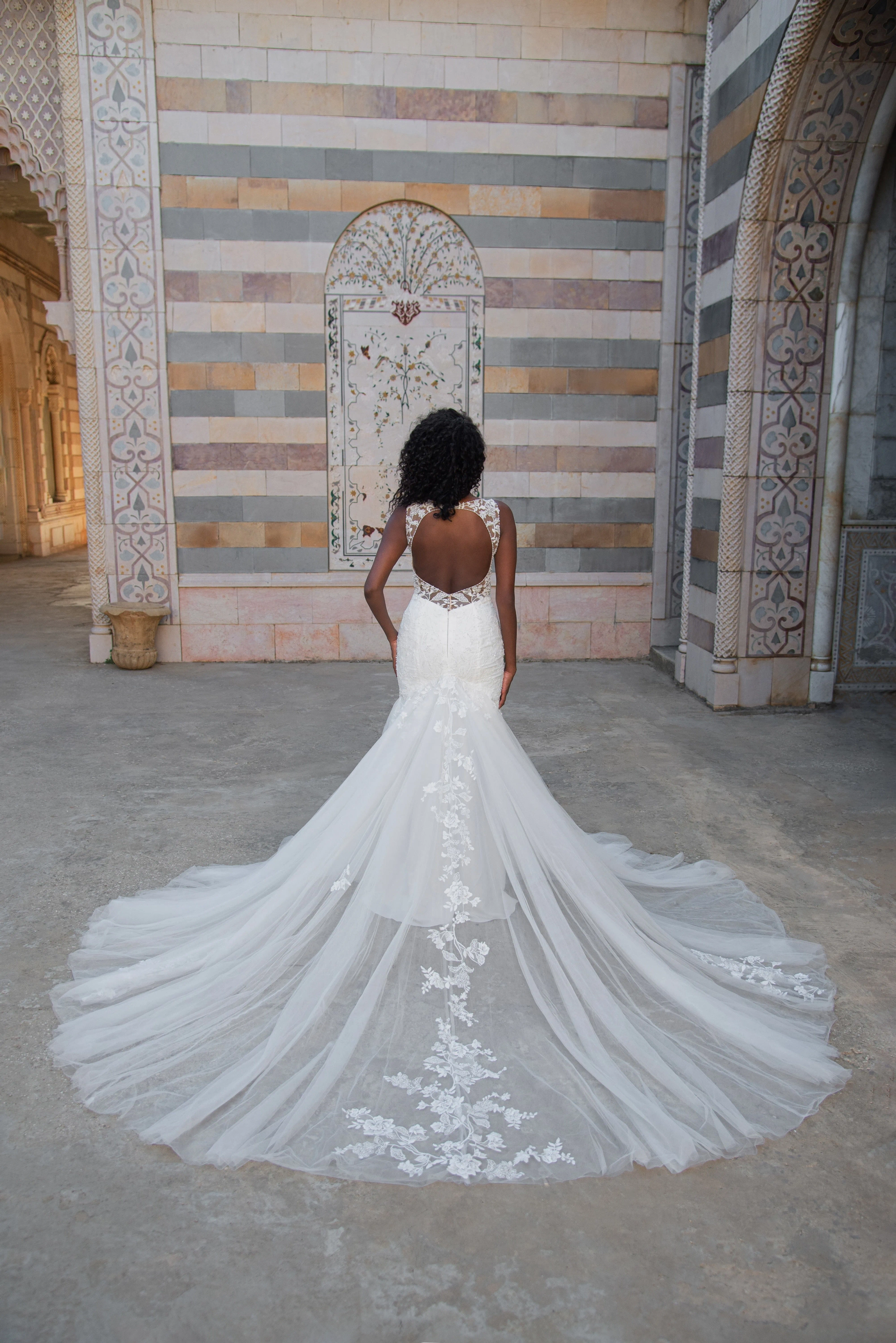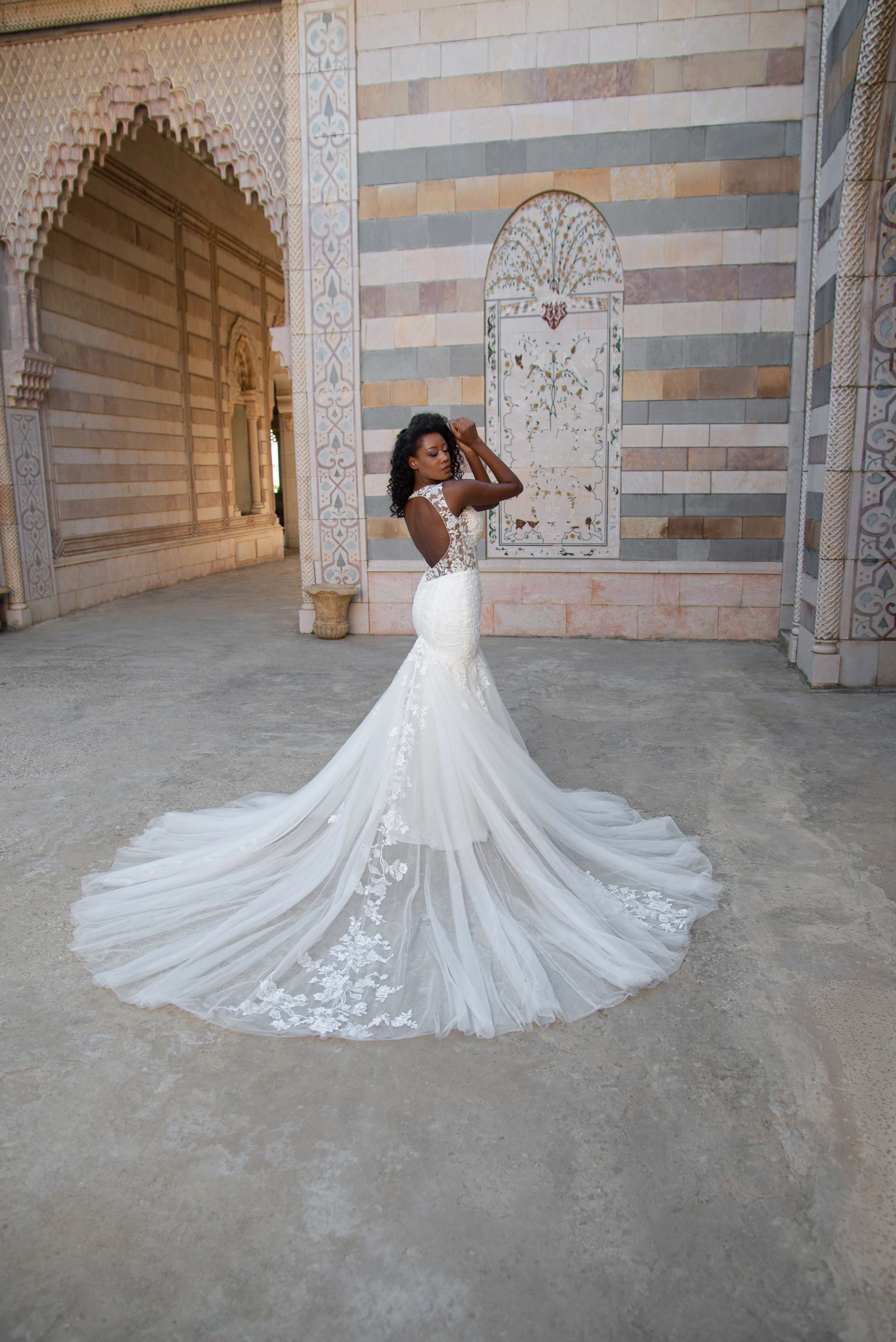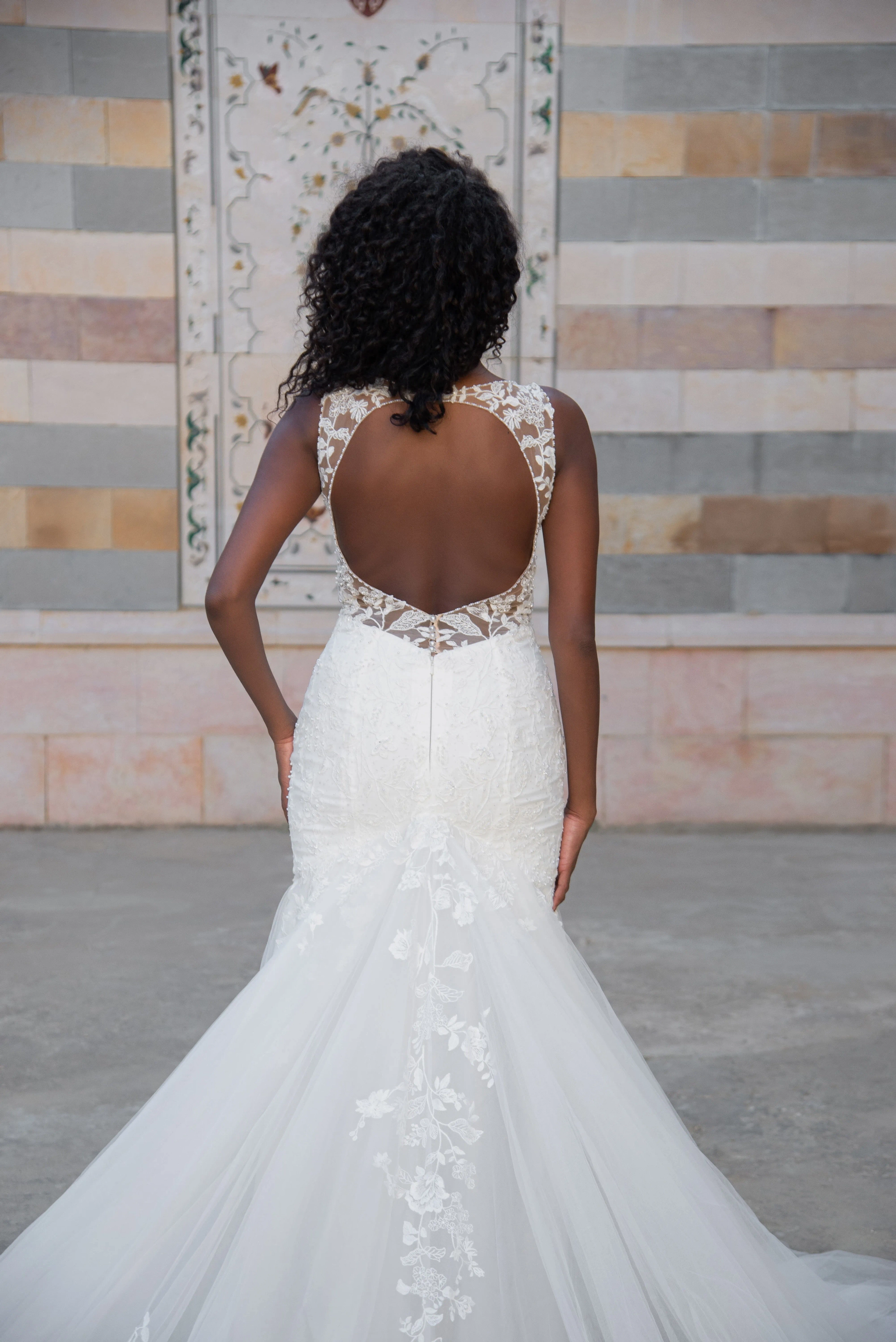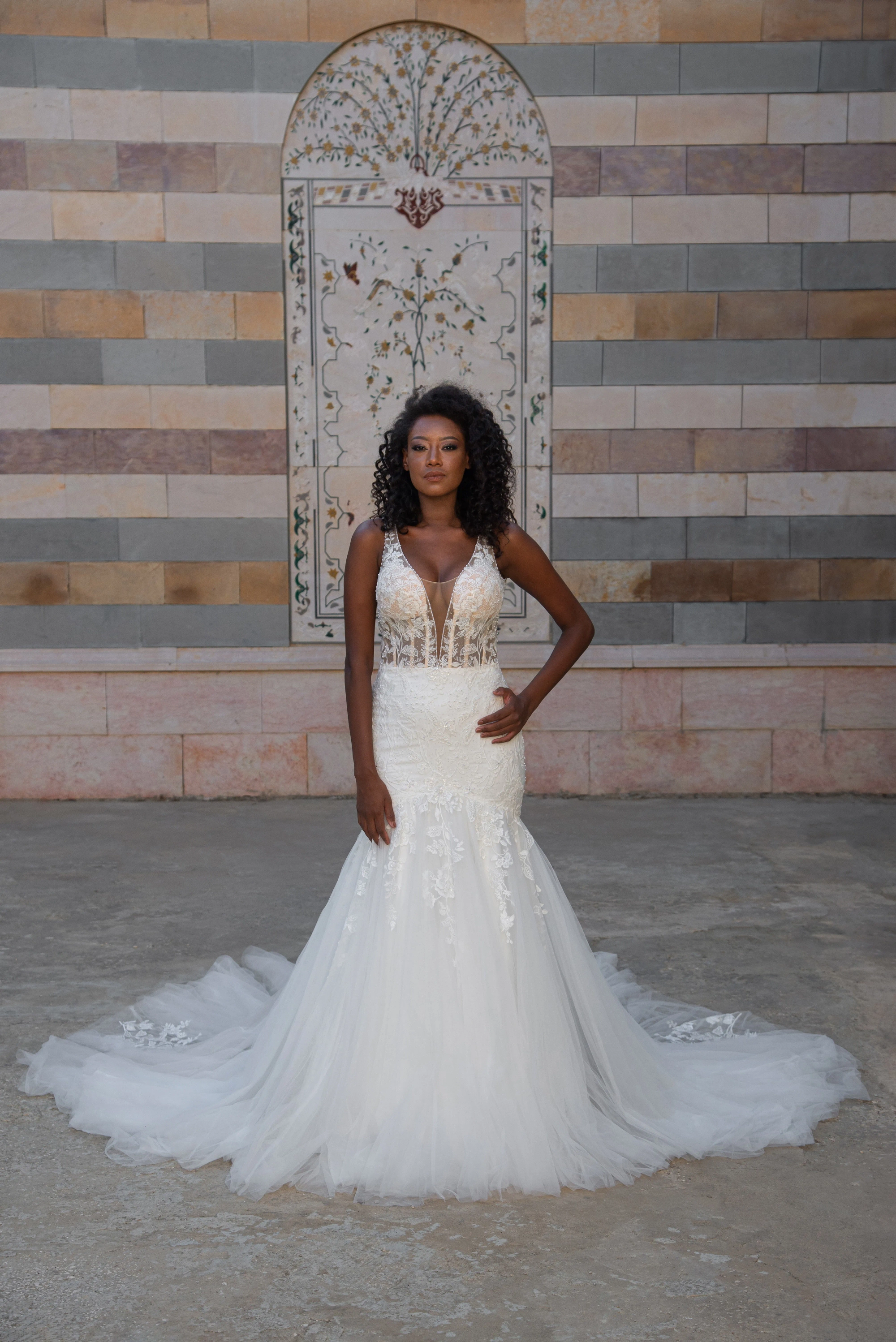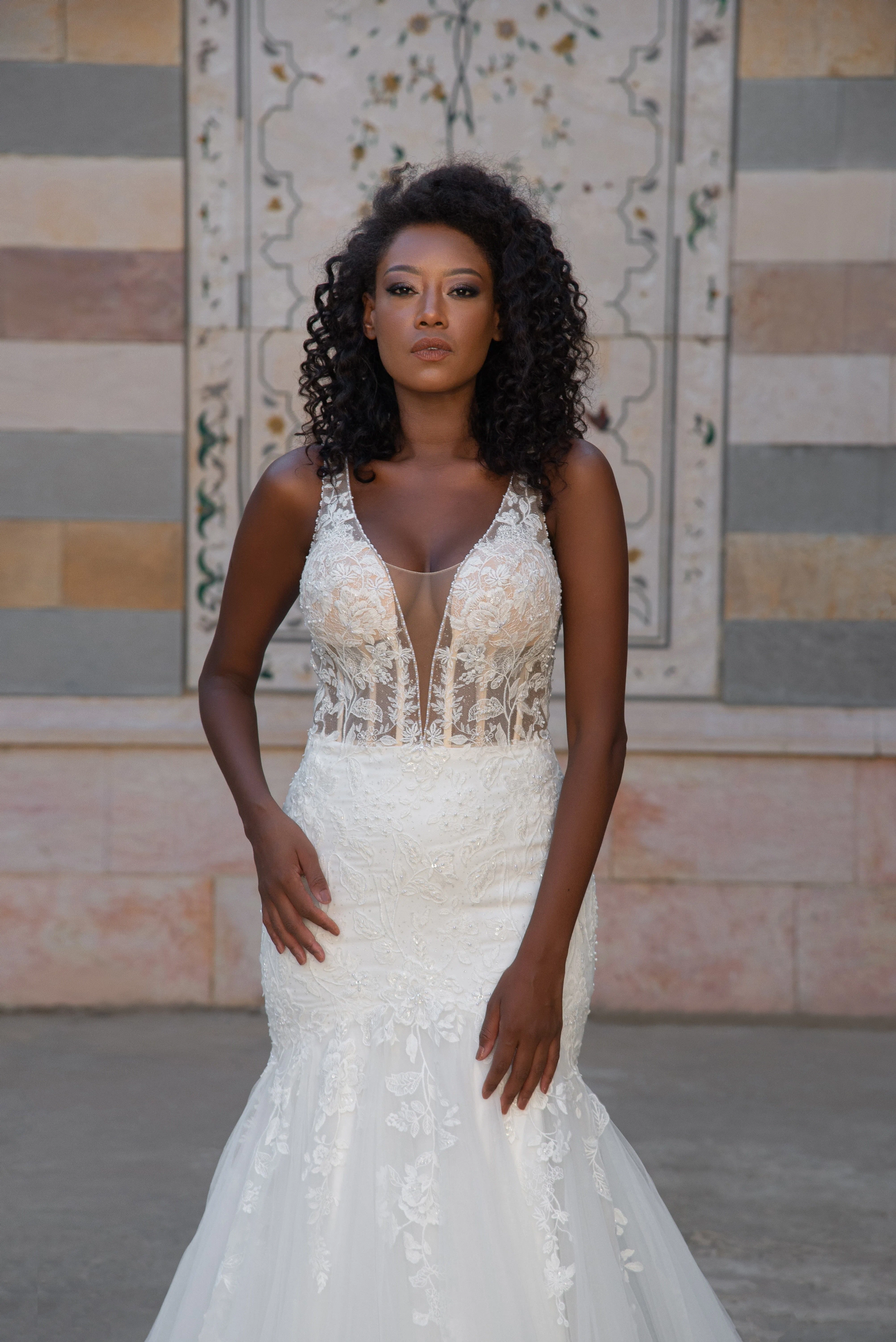 Introducing Ivy, a timeless beauty that will take your breath away! Delicate leaf and vine lace offer a unique take on a timeless look. The elongating plunging neckline cannot be missed, along with the elegantly tapered illusion straps that are supportive. The trumpet fit-and-flare skirt is the perfect easy-to-wear silhouette. Ivy is extra dramatic with layers of voluminous tulle through the skirt and train. The elegance of this look is elevated with an open illusion back with the vintage-inspired keyhole clasp at the top. Look no further than Ivy for that irreplaceable bridal bliss feeling you’ll remember for a lifetime.