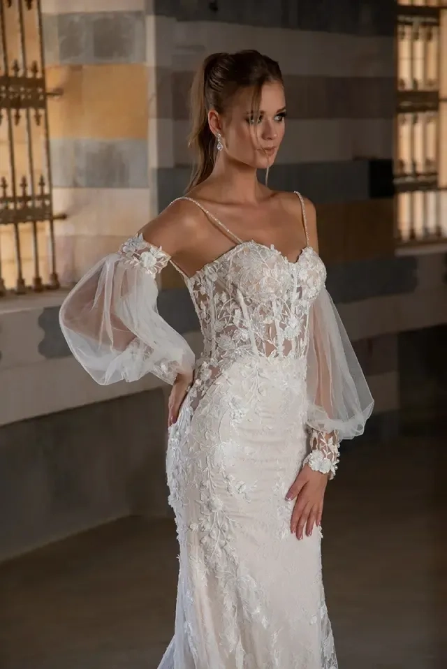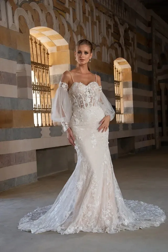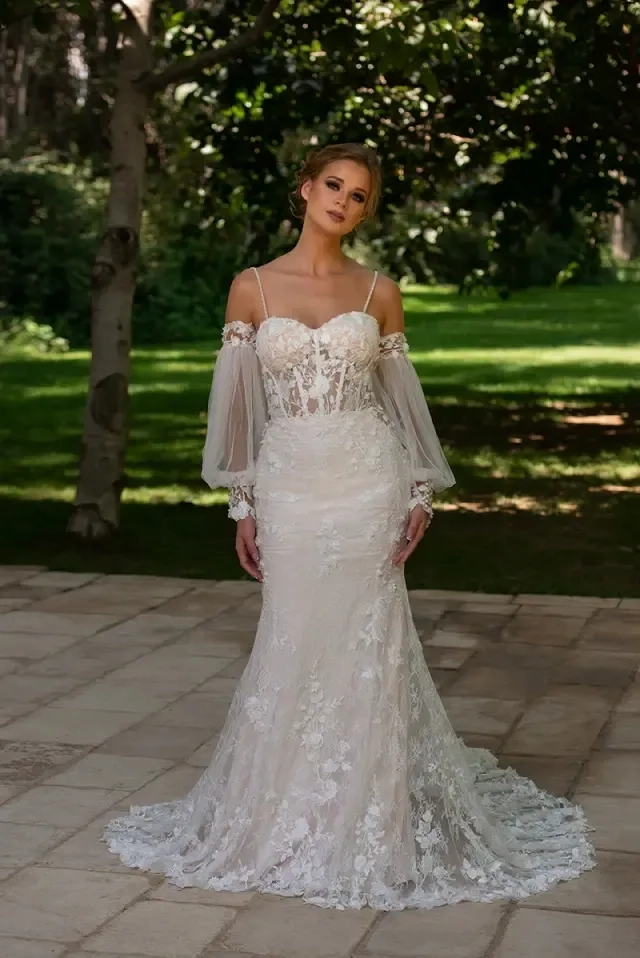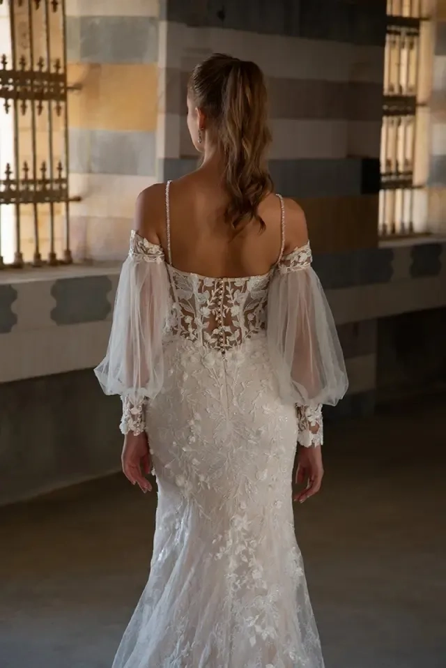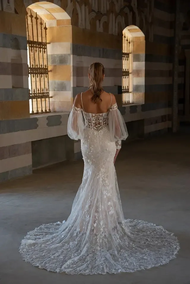 Say ‘I do’ in Kinsley! This fitted gown has a flirty flare with a corset sweetheart bodice and striking side cut-outs. The dainty iridescent crystal straps add a touch of sparkle. Kinsley dreamy matching bishop sleeves transform the timeless look to a modern boho style. With leaf and vine lacework throughout the gown and train, Kinsley is playful and whimsical.