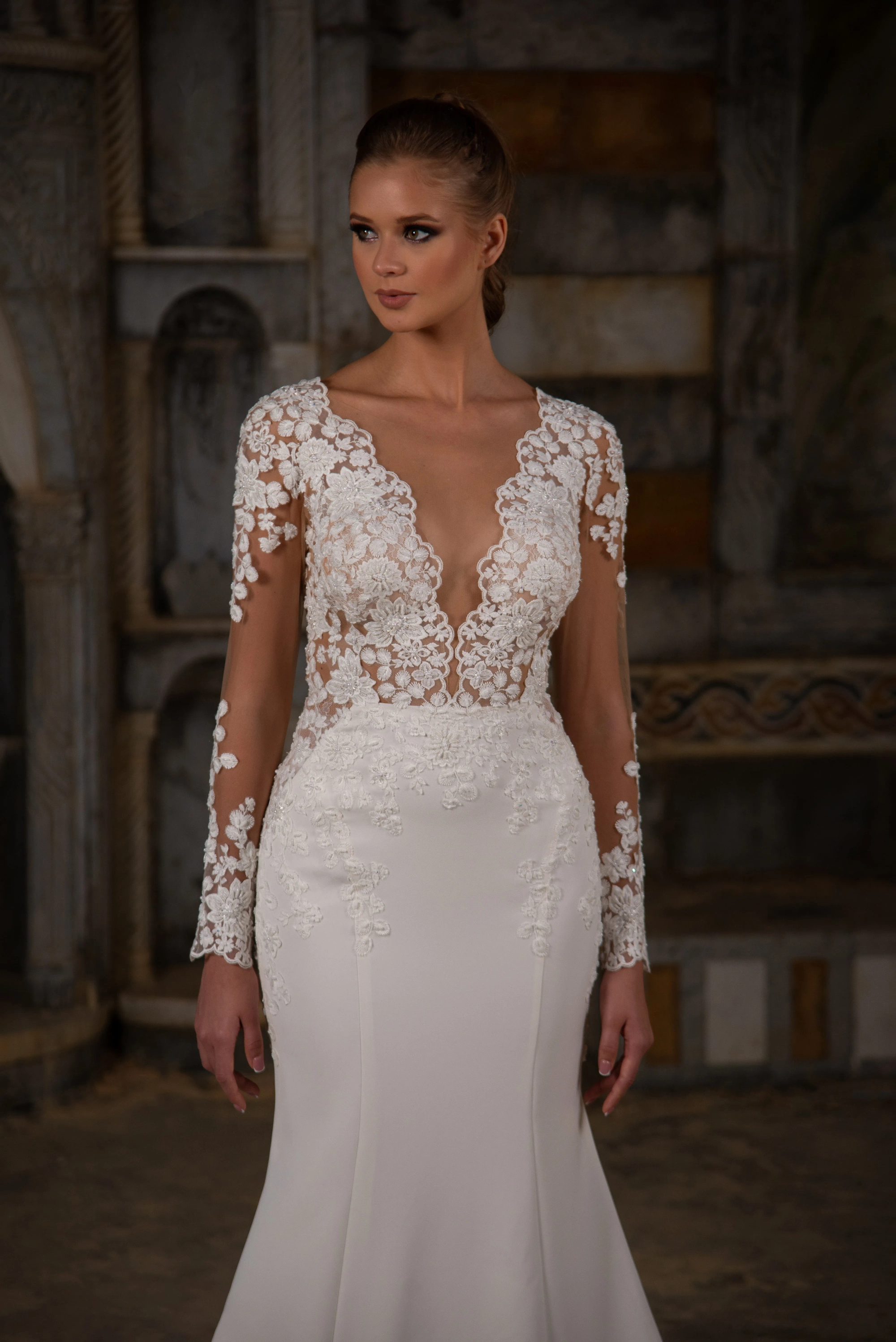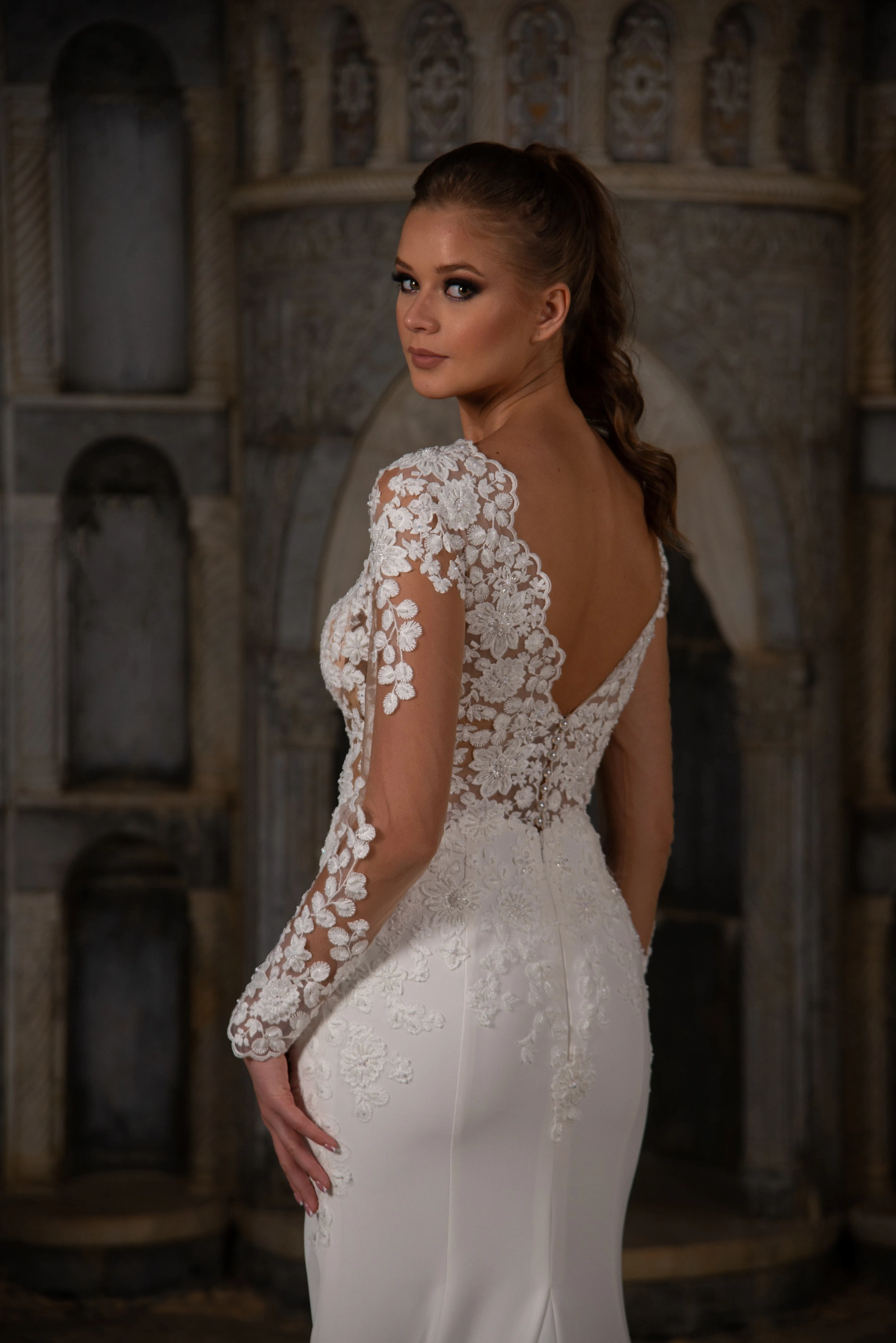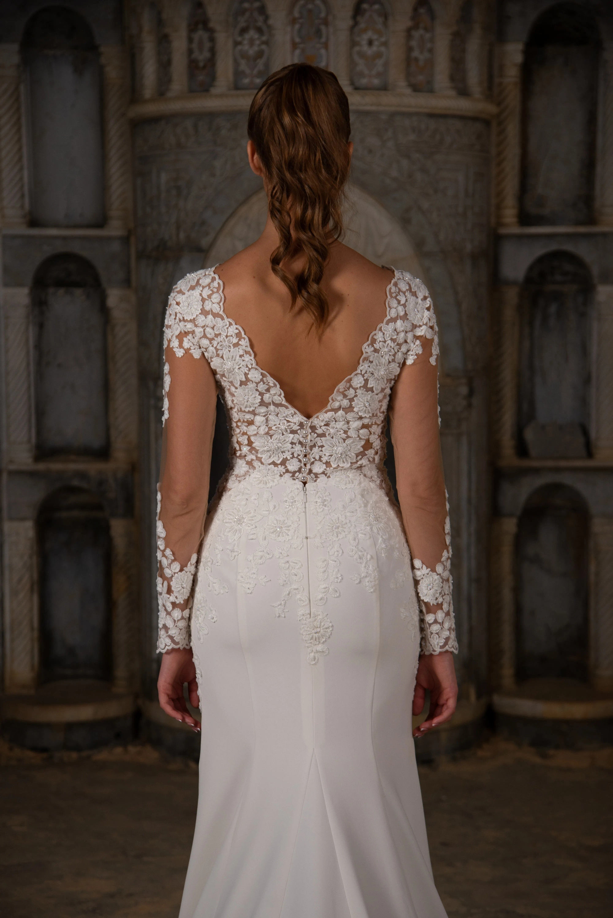 It’s all in the details with Nicole. The bodice is beautifully decorated with luxurious floral lace details. The sheer lace sleeves contour and add to the sheer elegance of the look. The striking plunging V-neckline is elegant and elongating, paired with a gorgeous V-cut back. Intricate side cut outs blend into the clean skirt, complemented with classic fabric buttons tracing down the back of the grown. The Nicole is finished with a dramatic floral train.