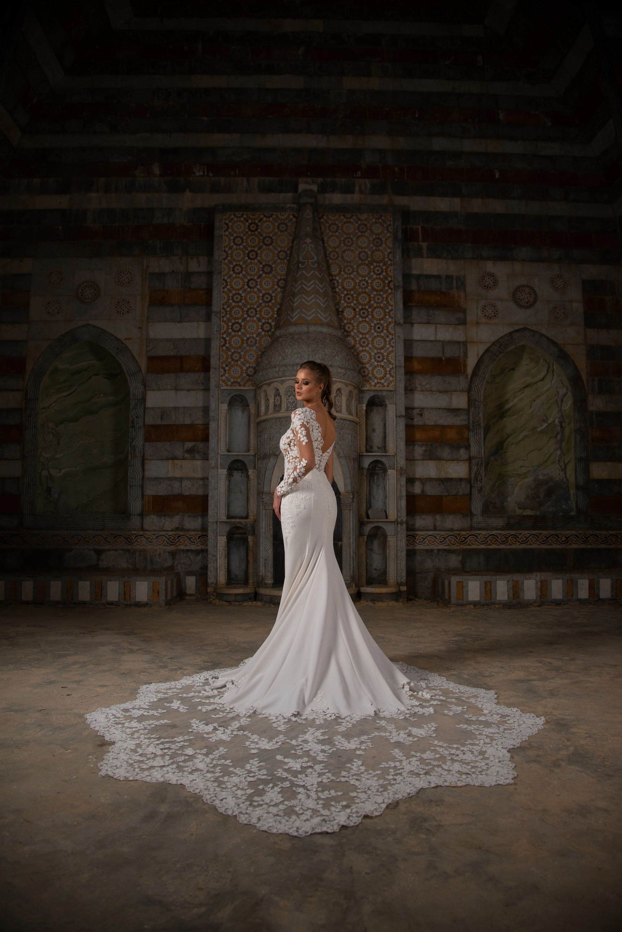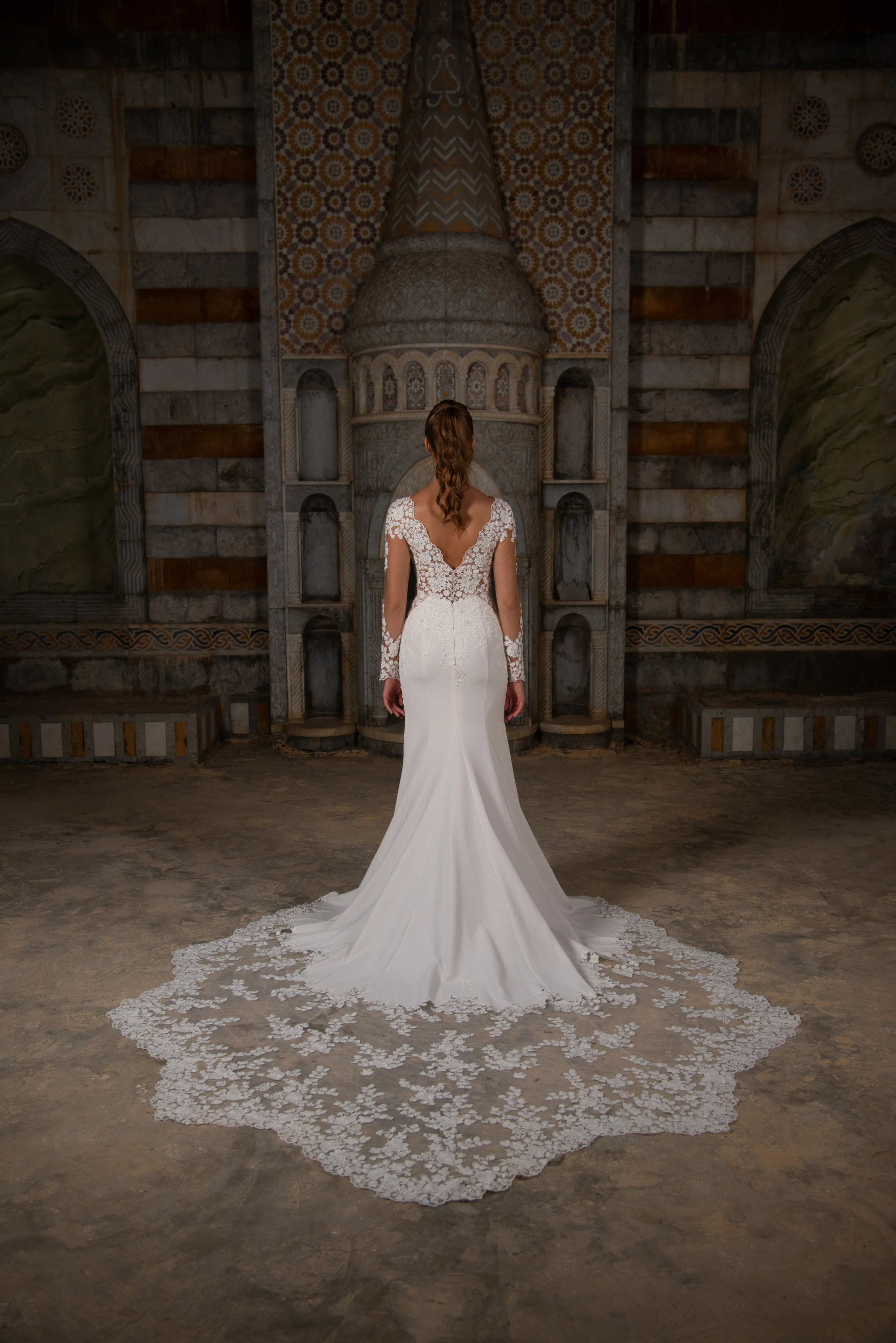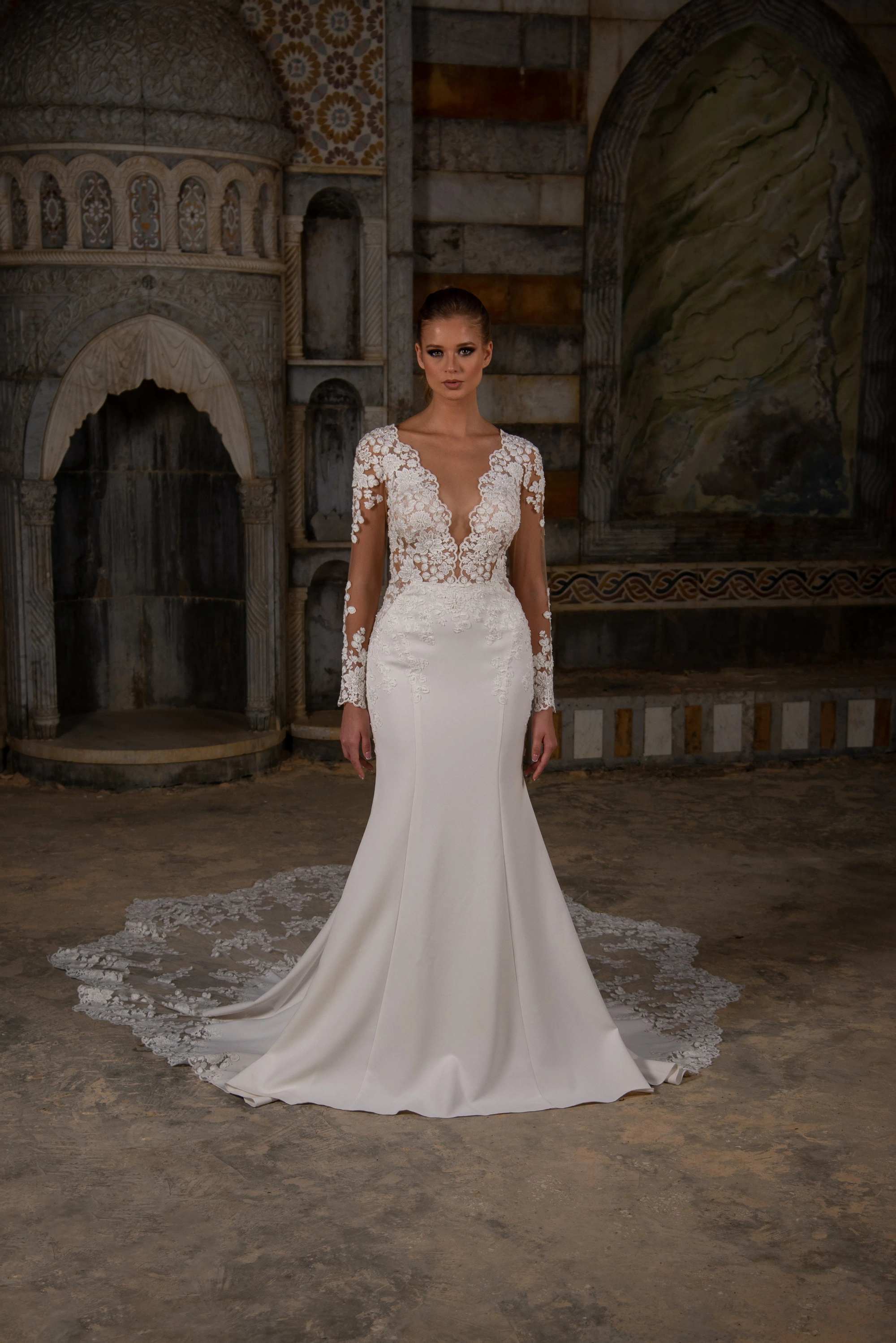 It’s all in the details with Nicole. The bodice is beautifully decorated with luxurious floral lace details. The sheer lace sleeves contour and add to the sheer elegance of the look. The striking plunging V-neckline is elegant and elongating, paired with a gorgeous V-cut back. Intricate side cut outs blend into the clean skirt, complemented with classic fabric buttons tracing down the back of the grown. The Nicole is finished with a dramatic floral train.