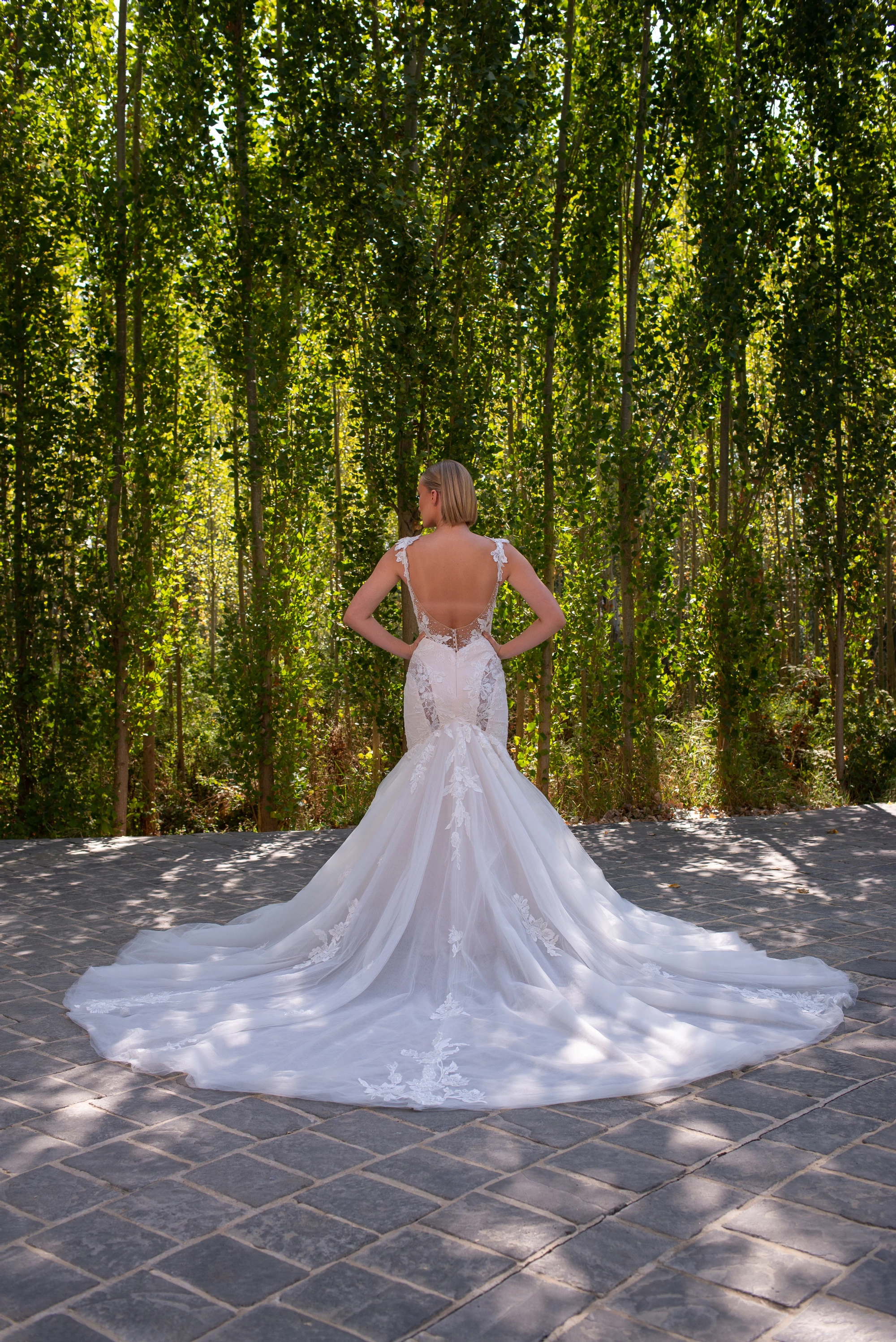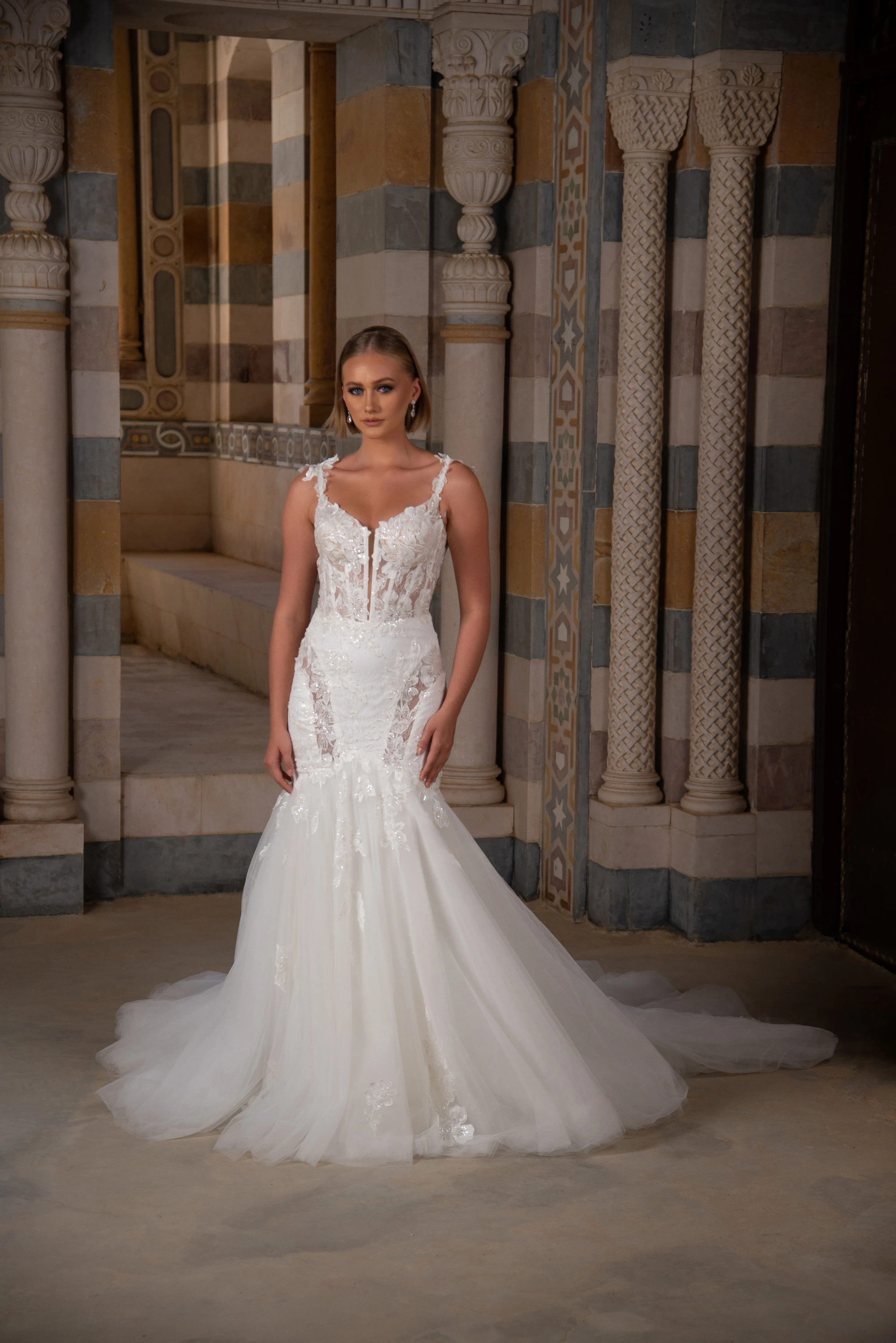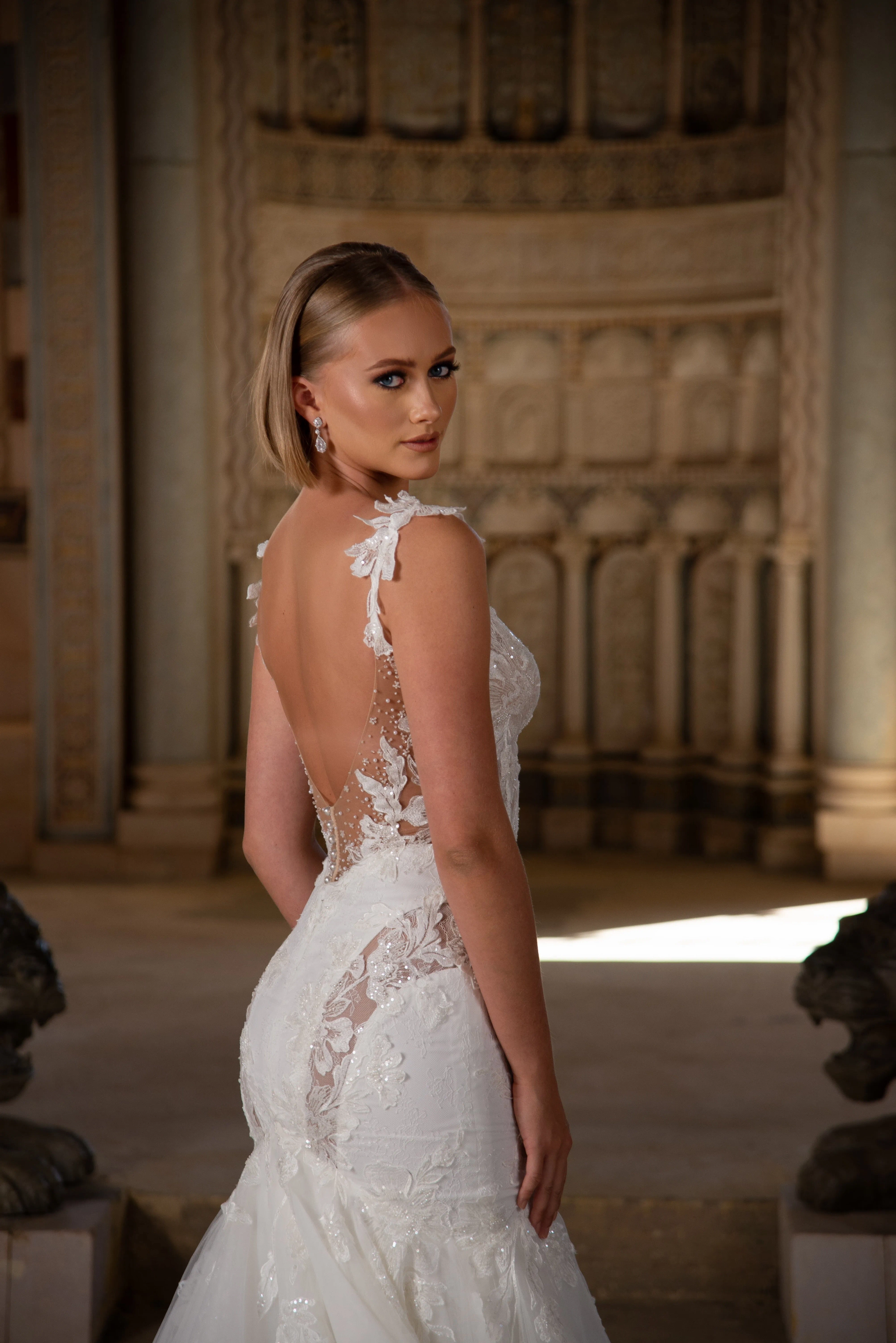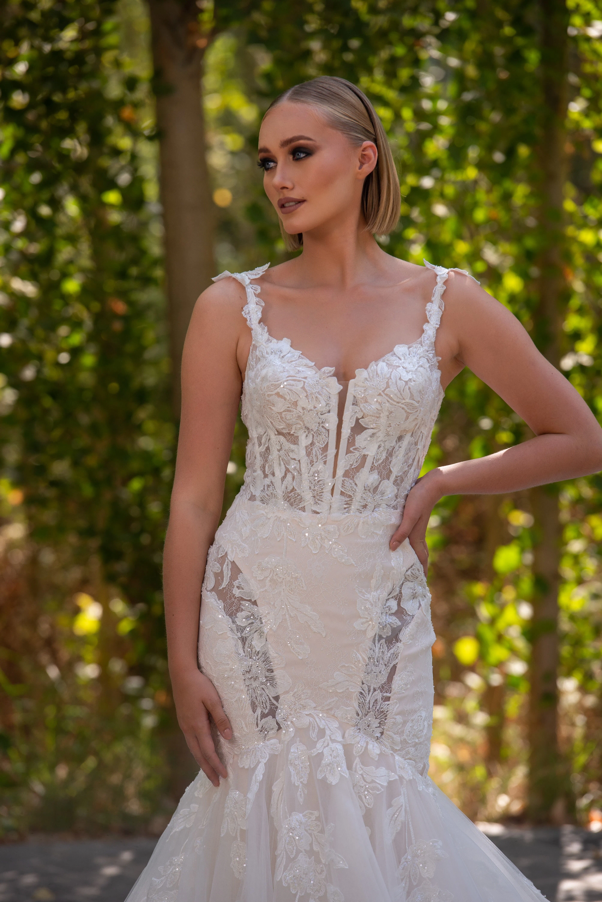 Fall head over heels for Faith! The corset bodice and floral straps are feminine and flirty. The trumpet style skirt is form-fitting through the hips, with glamorous hip cut outs to contour the silhouette. The skirt dramatically flares into dreamy layers of tulle and extends into a cathedral train showcasing appliqué cascading down. The low-cut sheer back is decorated with illusion crystals, beading and pearls, making Faith a true showstopper. Feel effortlessly gorgeous in Faith on your day.