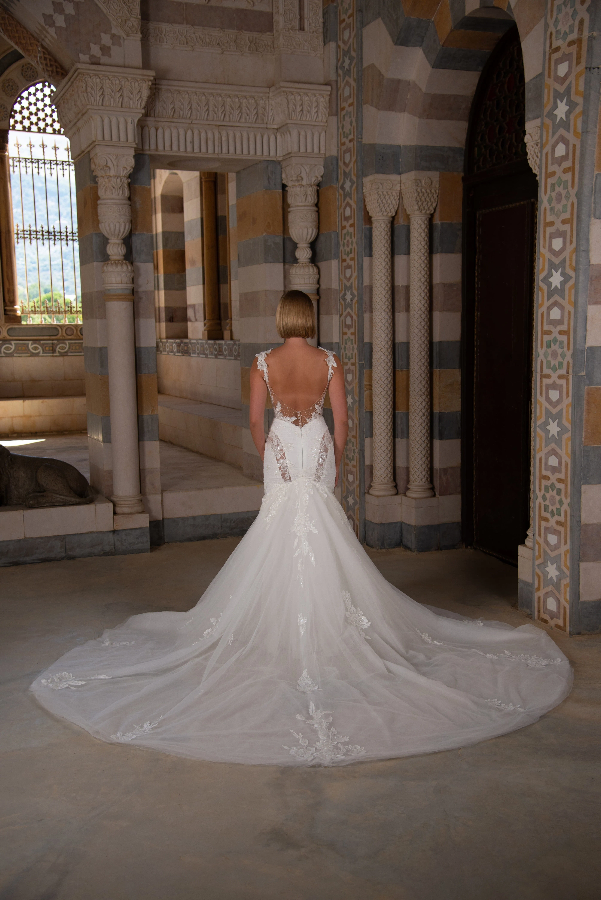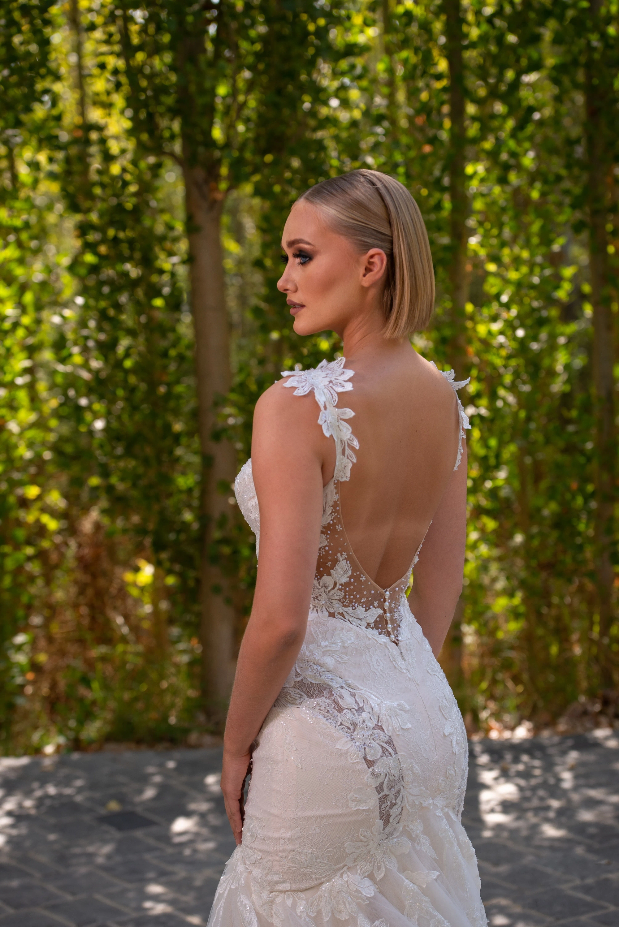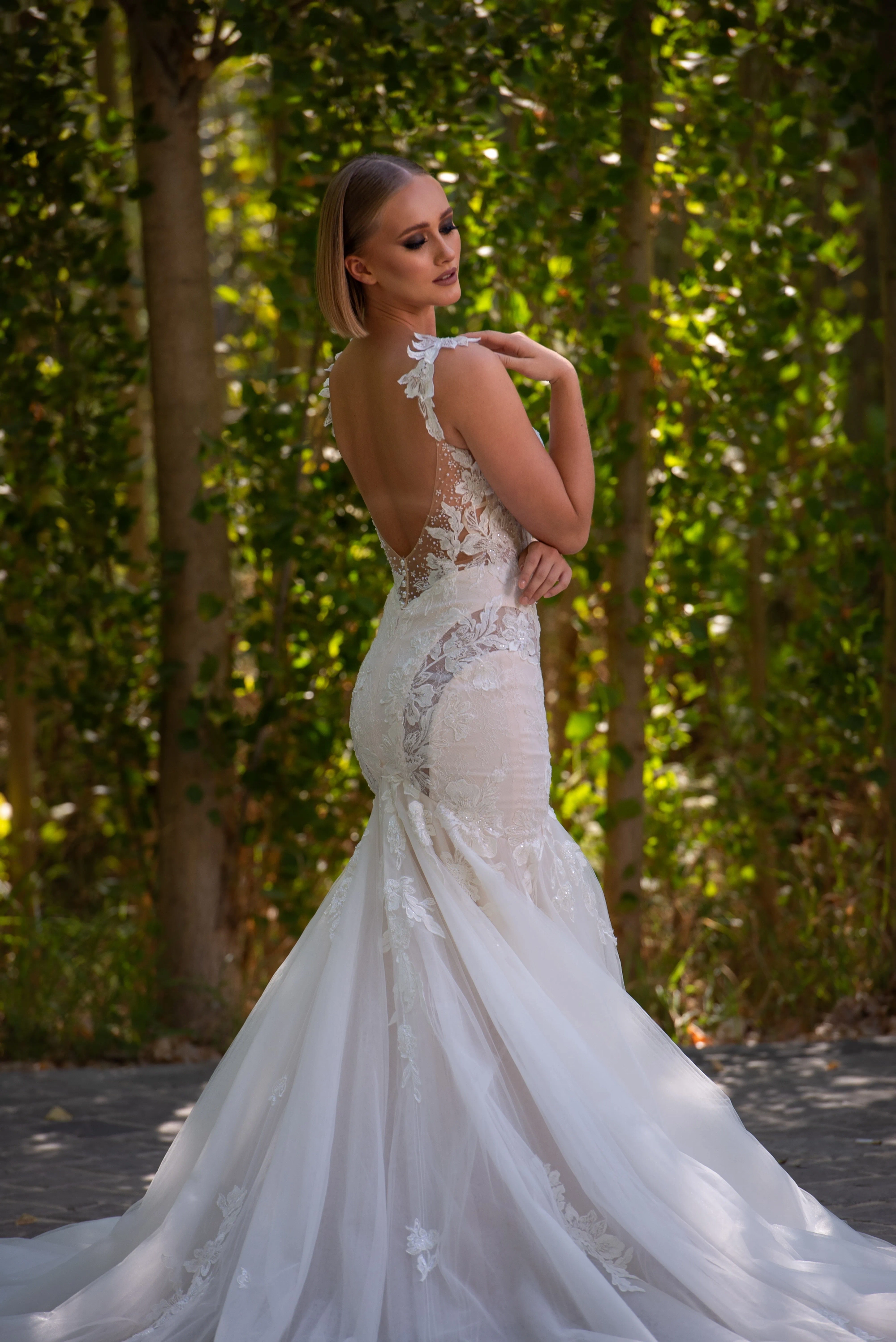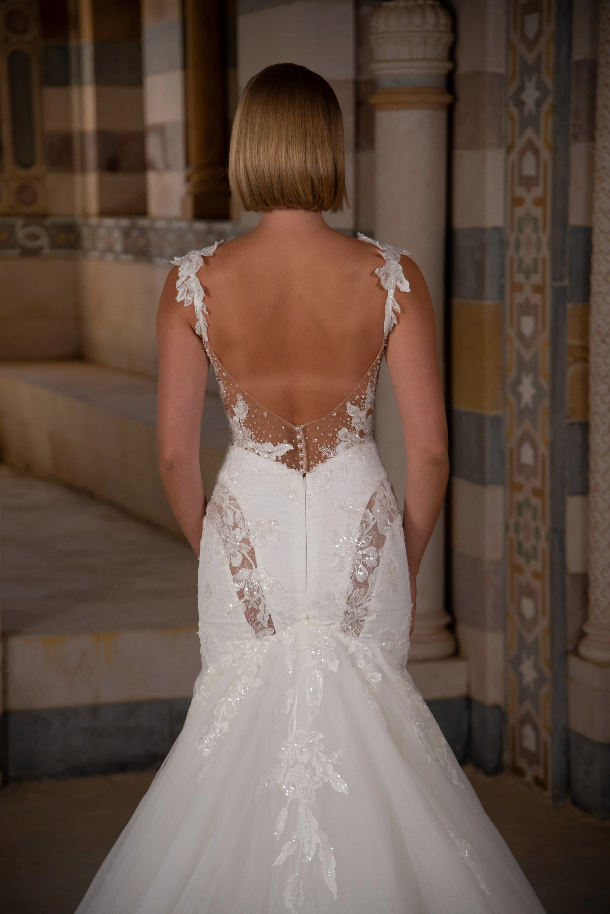 Fall head over heels for Faith! The corset bodice and floral straps are feminine and flirty. The trumpet style skirt is form-fitting through the hips, with glamorous hip cut outs to contour the silhouette. The skirt dramatically flares into dreamy layers of tulle and extends into a cathedral train showcasing appliqué cascading down. The low-cut sheer back is decorated with illusion crystals, beading and pearls, making Faith a true showstopper. Feel effortlessly gorgeous in Faith on your day.