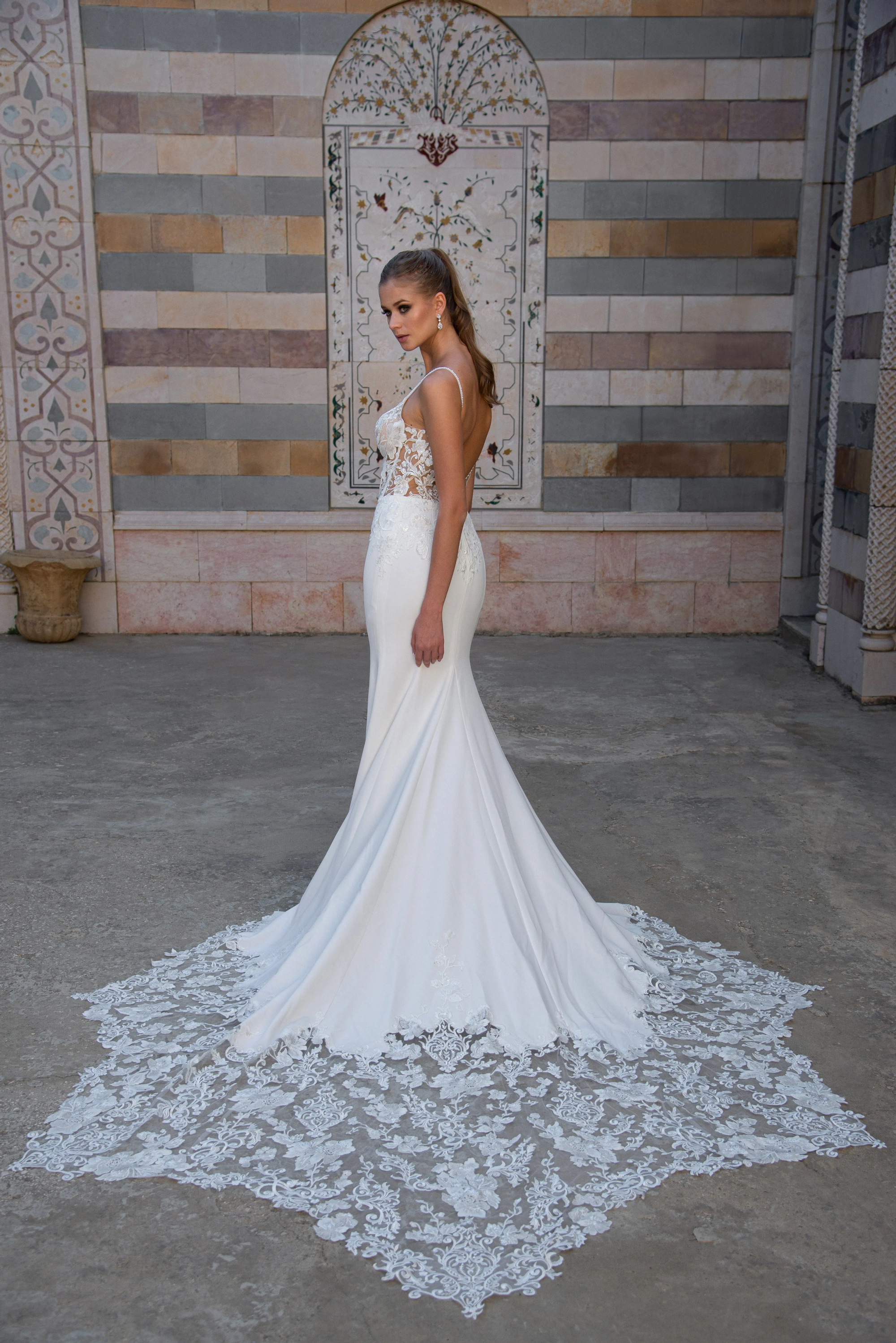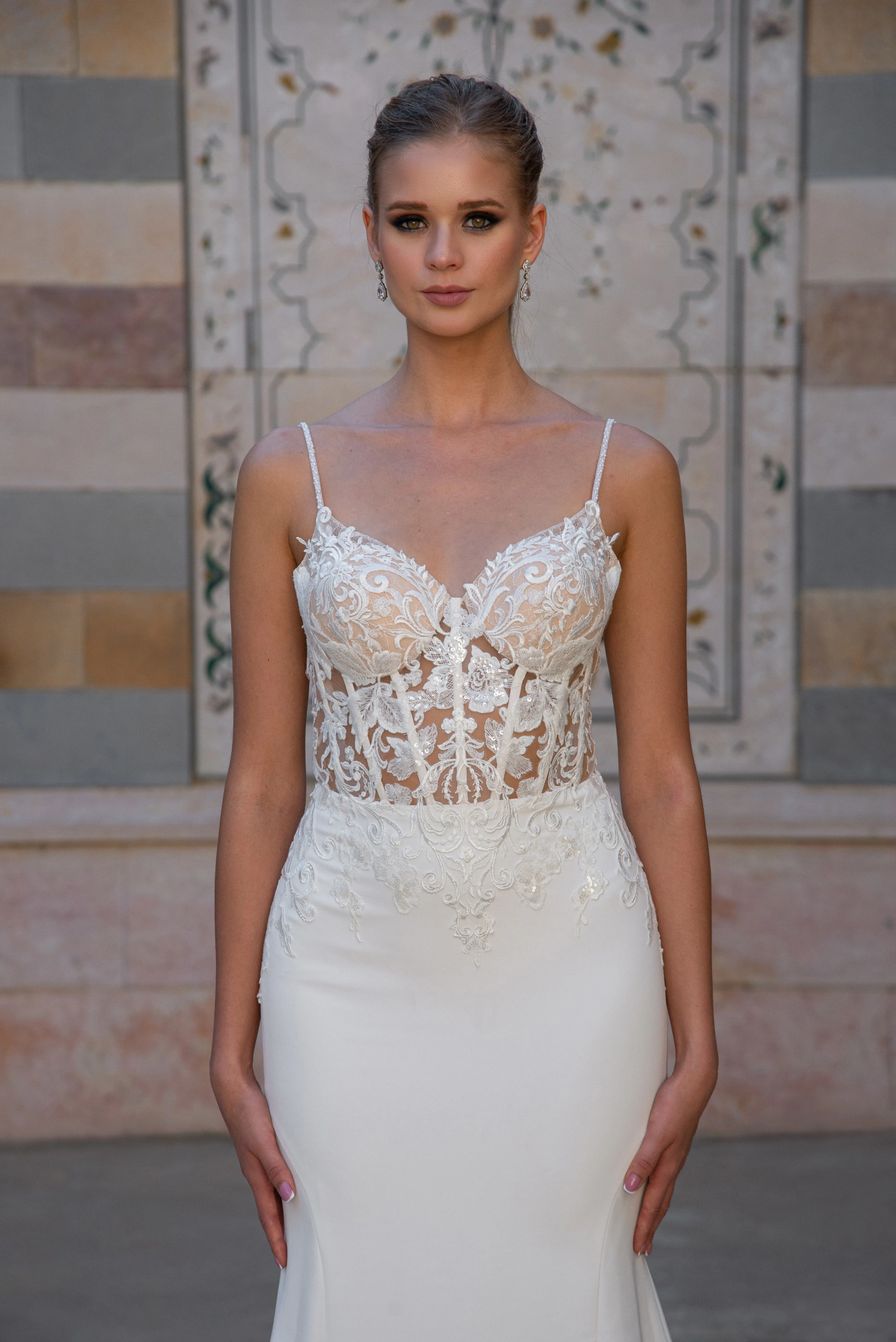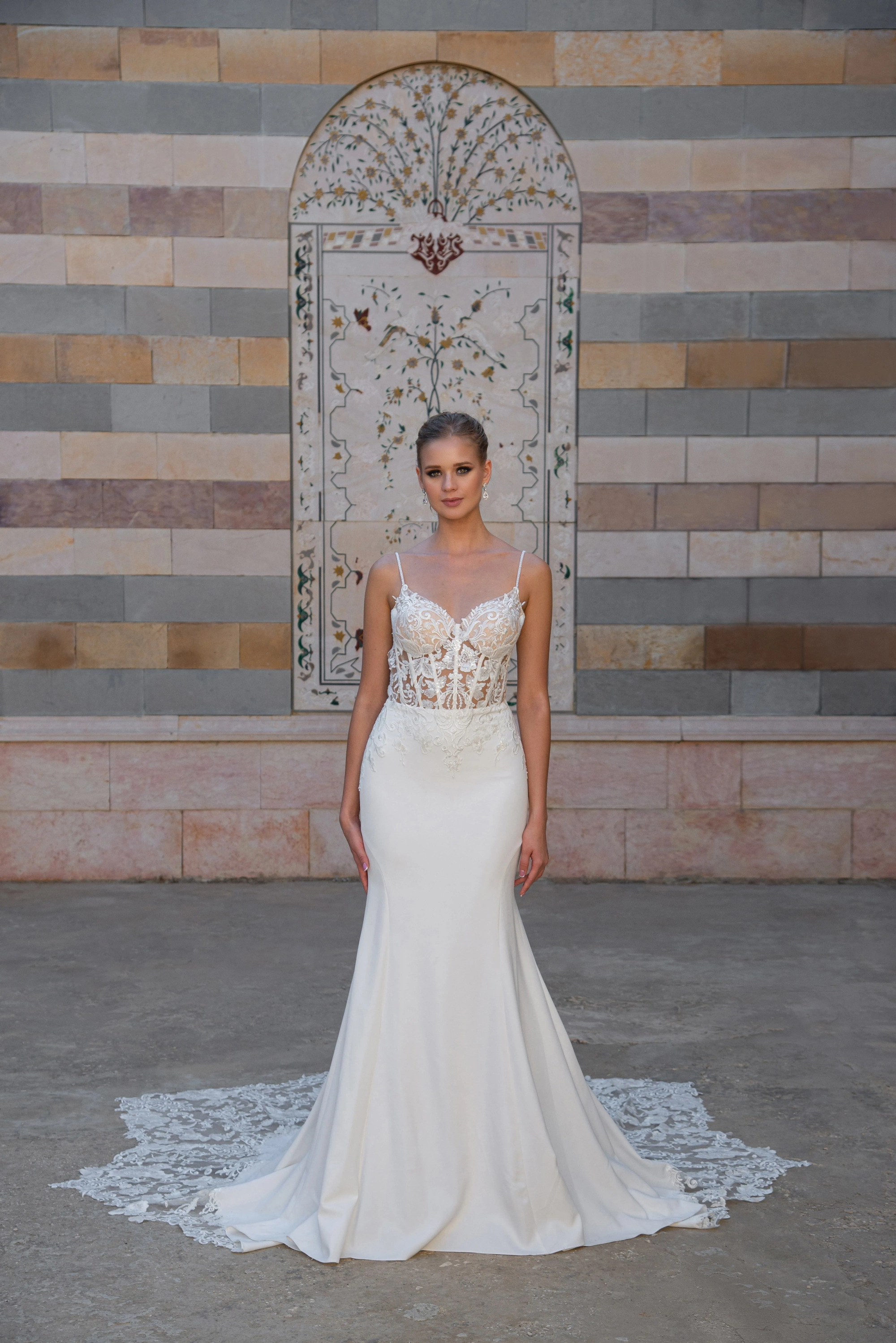 The Alina gown invokes elegance, in a modern yet timeless design. The striking lace and intricate embellishments flow gracefully from the corset bodice onto the sophisticated clean skirt. The mesmerizing iridescent crystals accent the dainty straps and outline the low-cut sheer open back. This polished look is finished with an incomparably unique, sheer lace train.