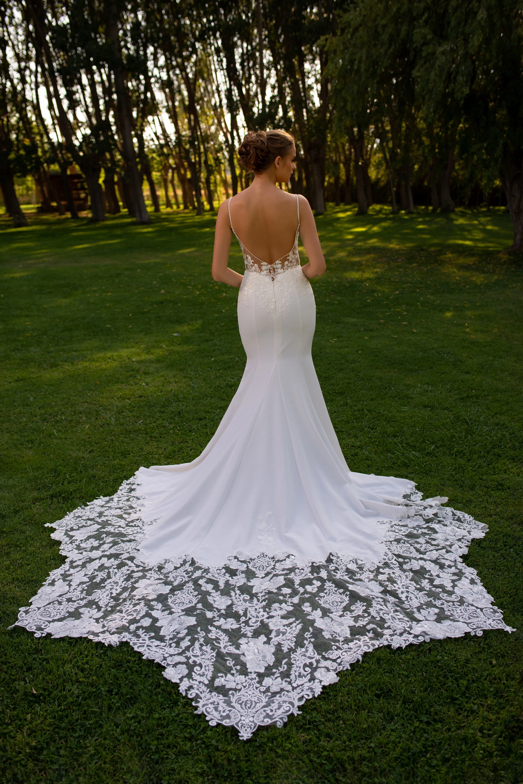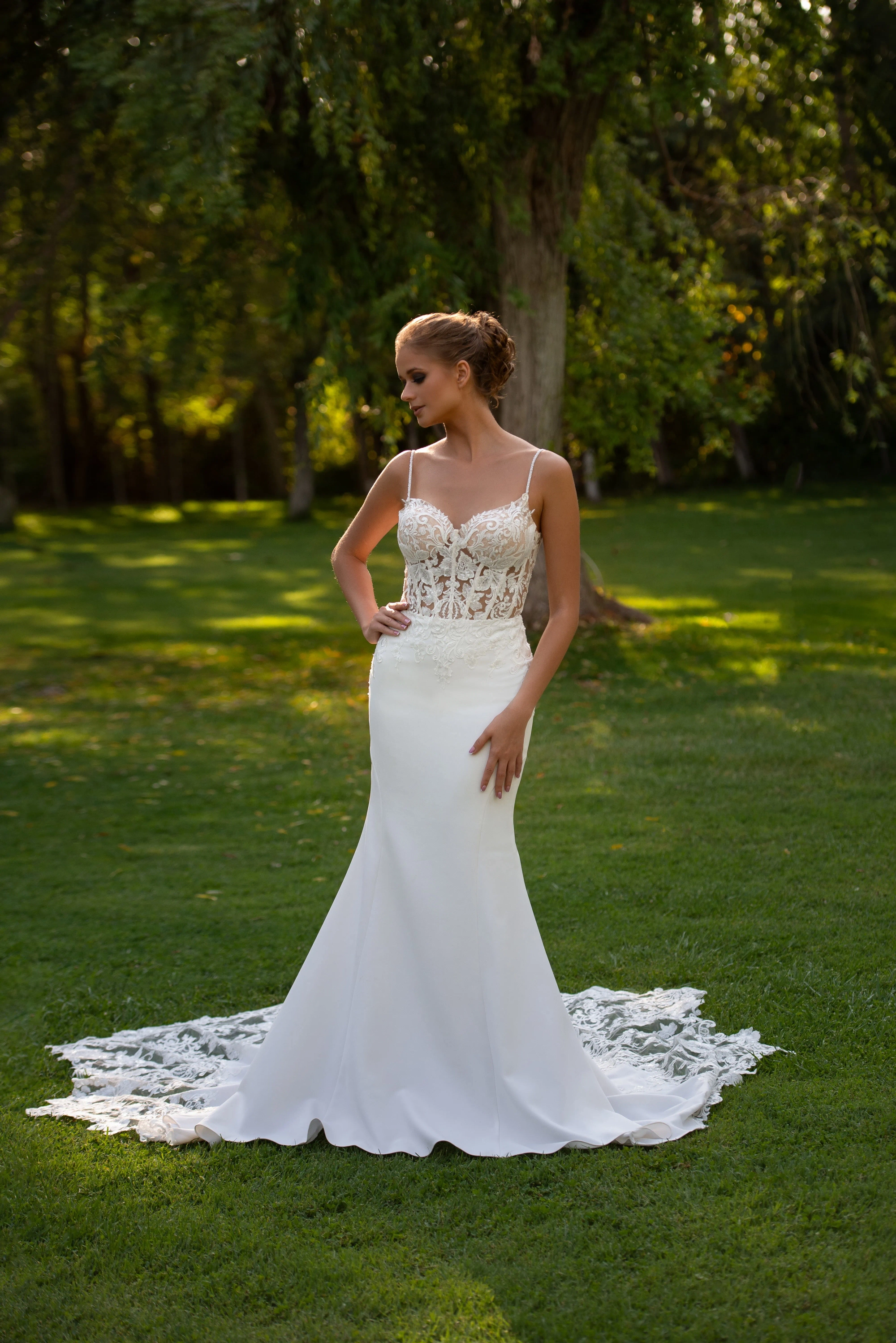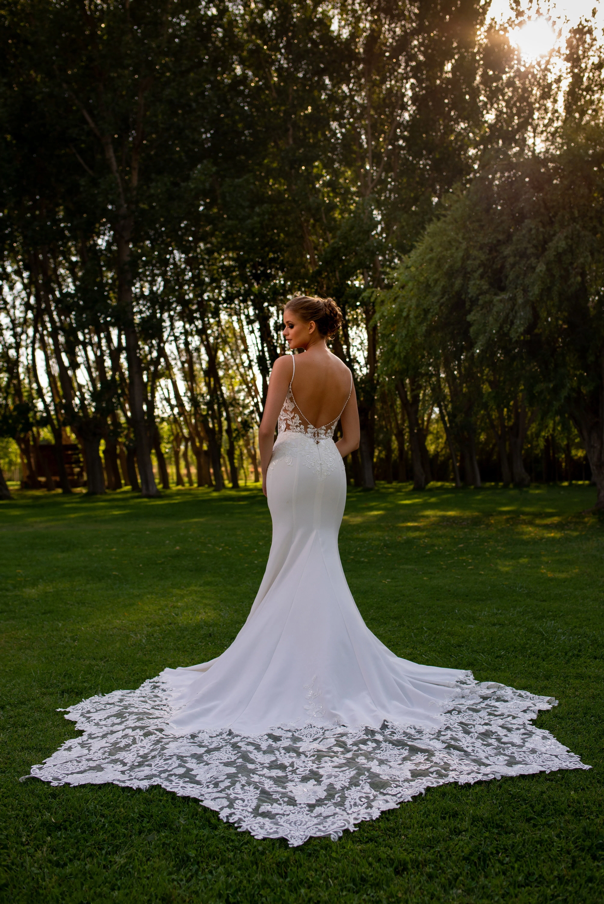 The Alina gown invokes elegance, in a modern yet timeless design. The striking lace and intricate embellishments flow gracefully from the corset bodice onto the sophisticated clean skirt. The mesmerizing iridescent crystals accent the dainty straps and outline the low-cut sheer open back. This polished look is finished with an incomparably unique, sheer lace train.