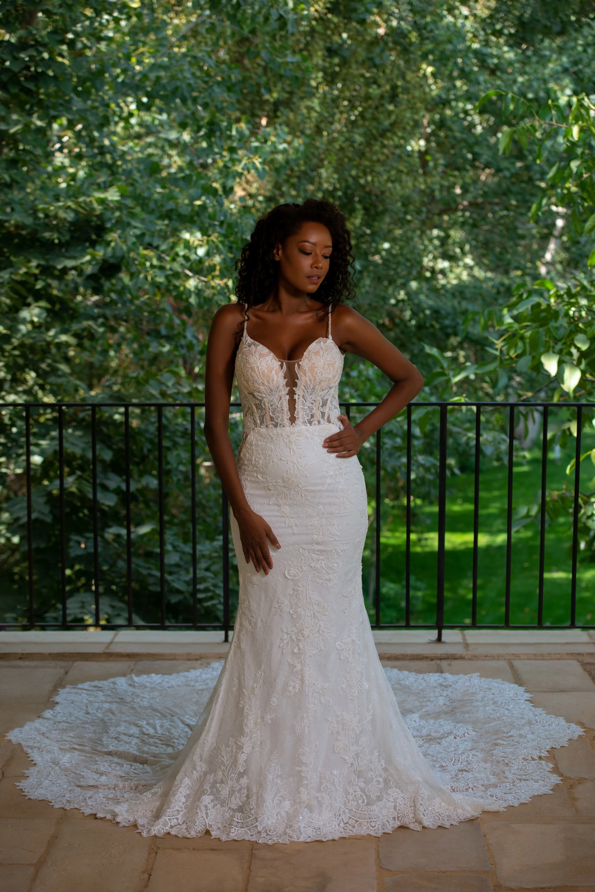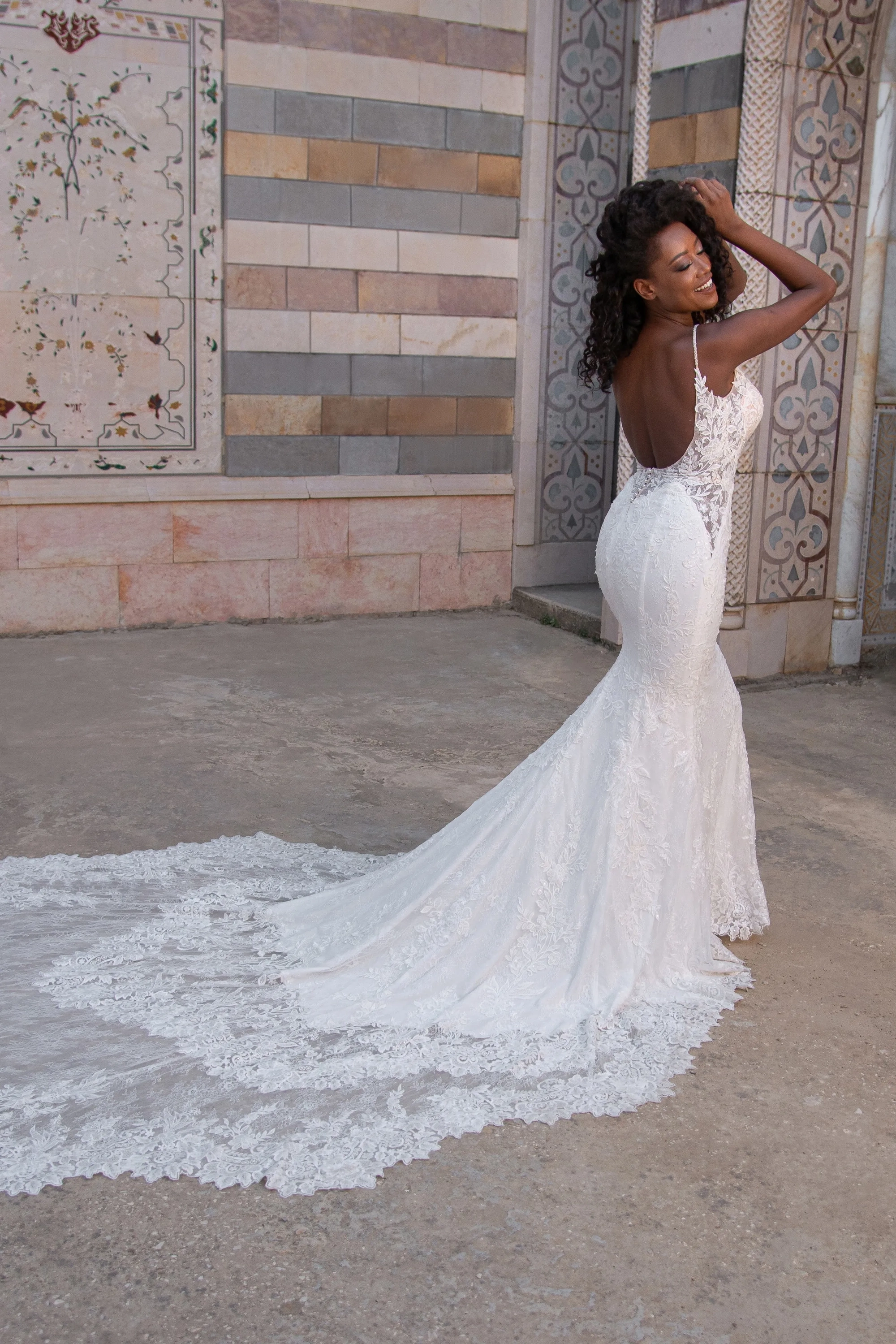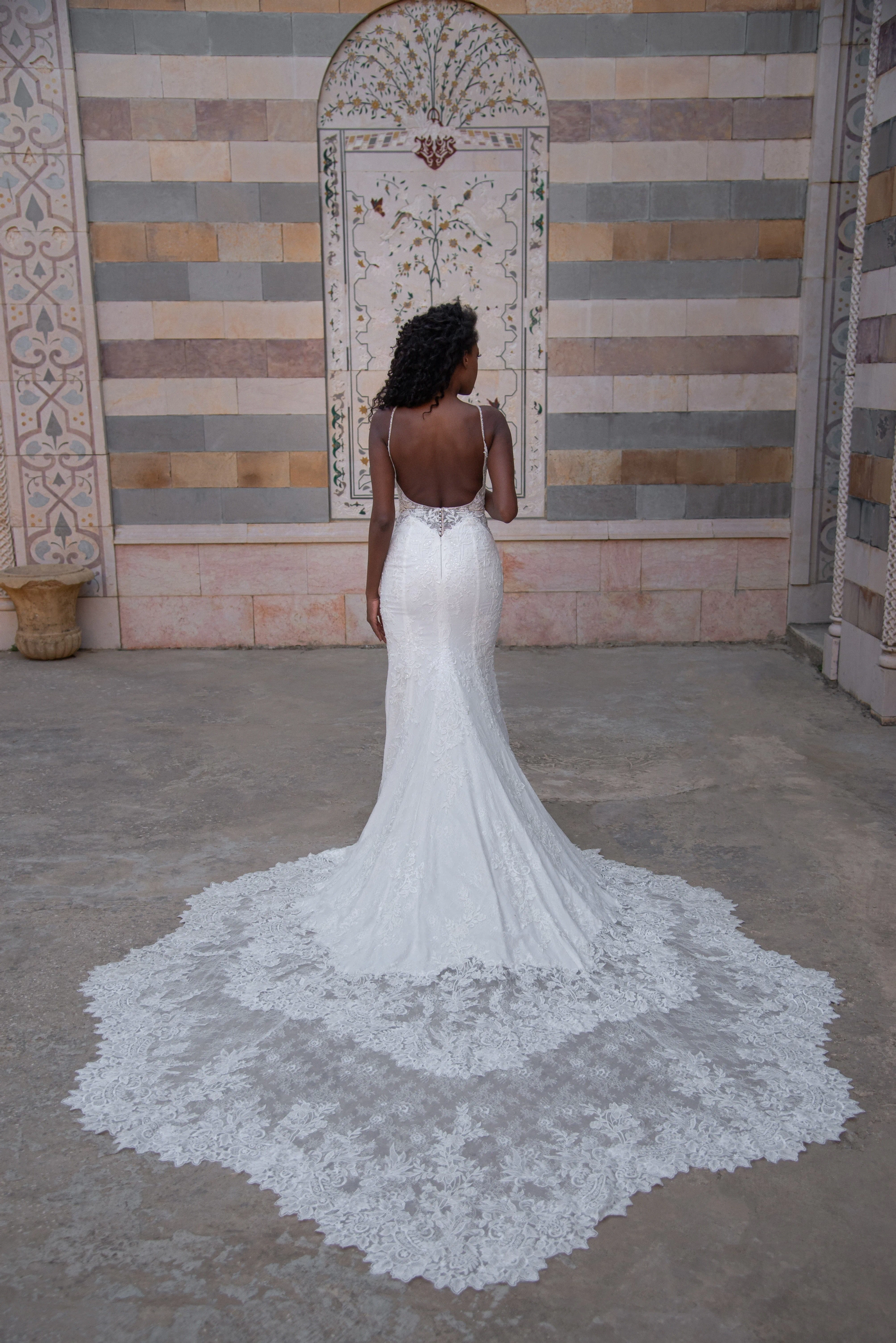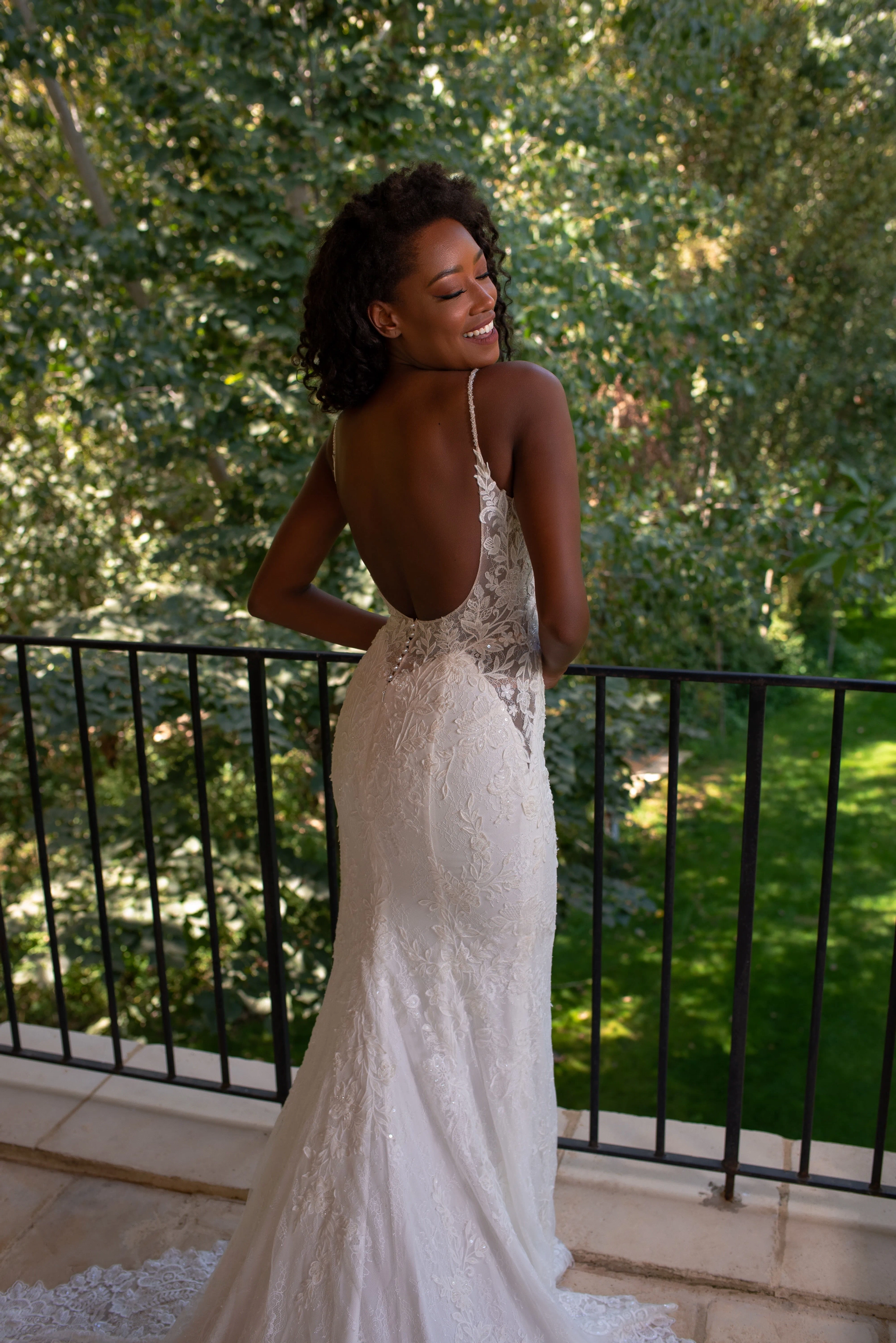 Marquette is bridal beauty from head to toe! The exquisite layers of Chantilly lace and appliqué make Marquette a go-to for the flirty and feminine bride. The plunging neckline is elongating, accenting the silhouette, with dainty iridescent crystal straps that elegantly face-frame so you stand out on your day. The low-cut rounded open back and striking side cut-outs photograph beautifully from every angle. The classic look of the Marquette is elevated with a dramatic length cathedral train. Soft yet bold, with eye-catching appliqué layered atop Chantilly lace, Marquette’s train is a dream come true. In Marquette, you’re sure to feel effortlessly you.