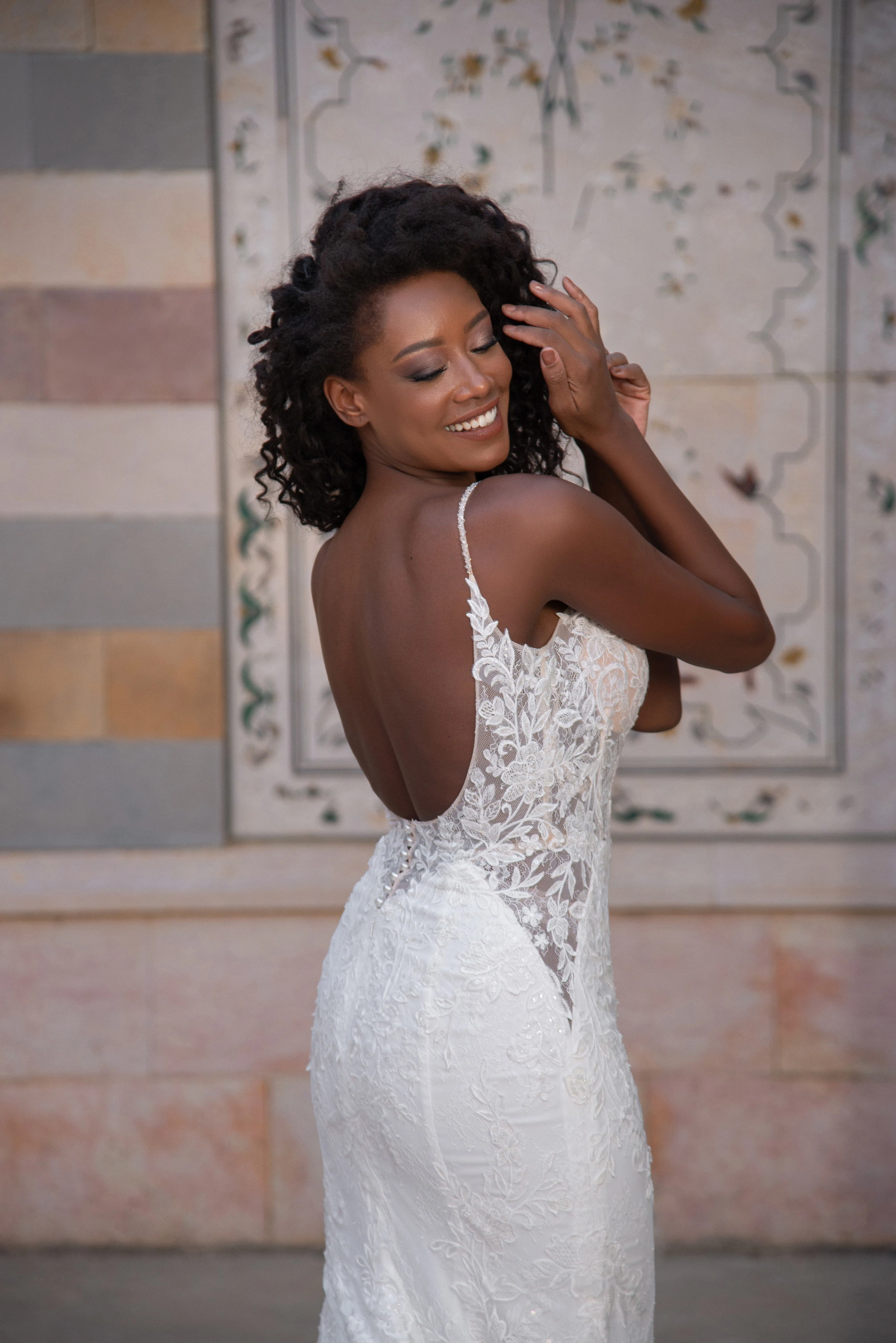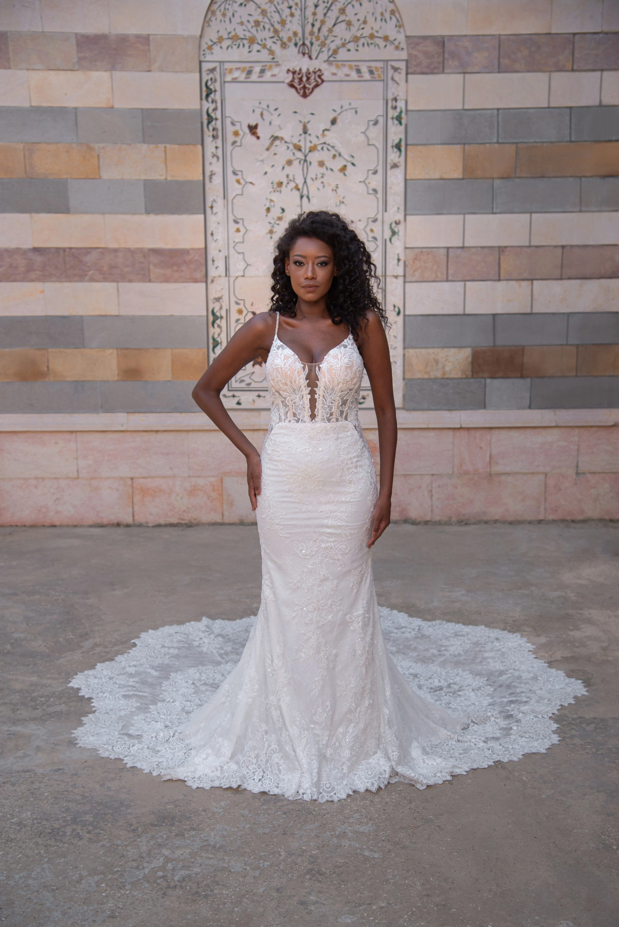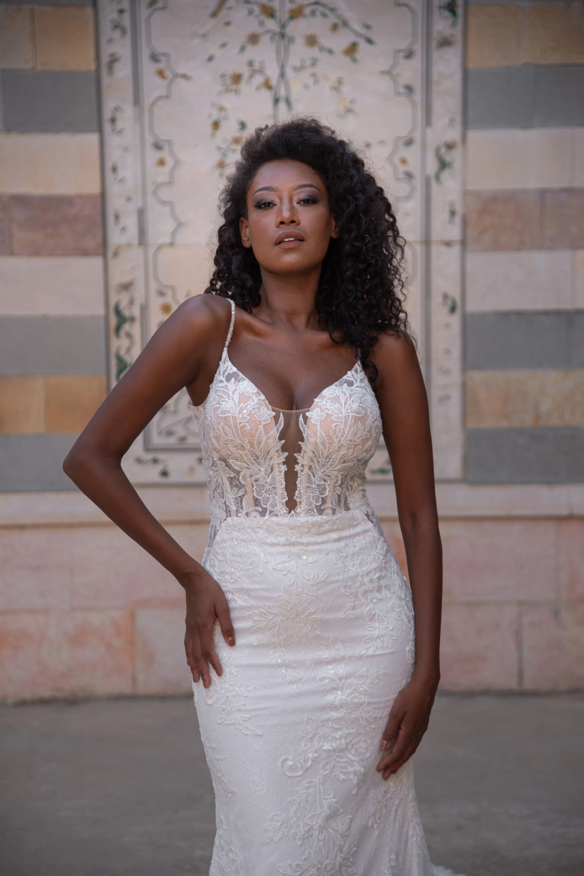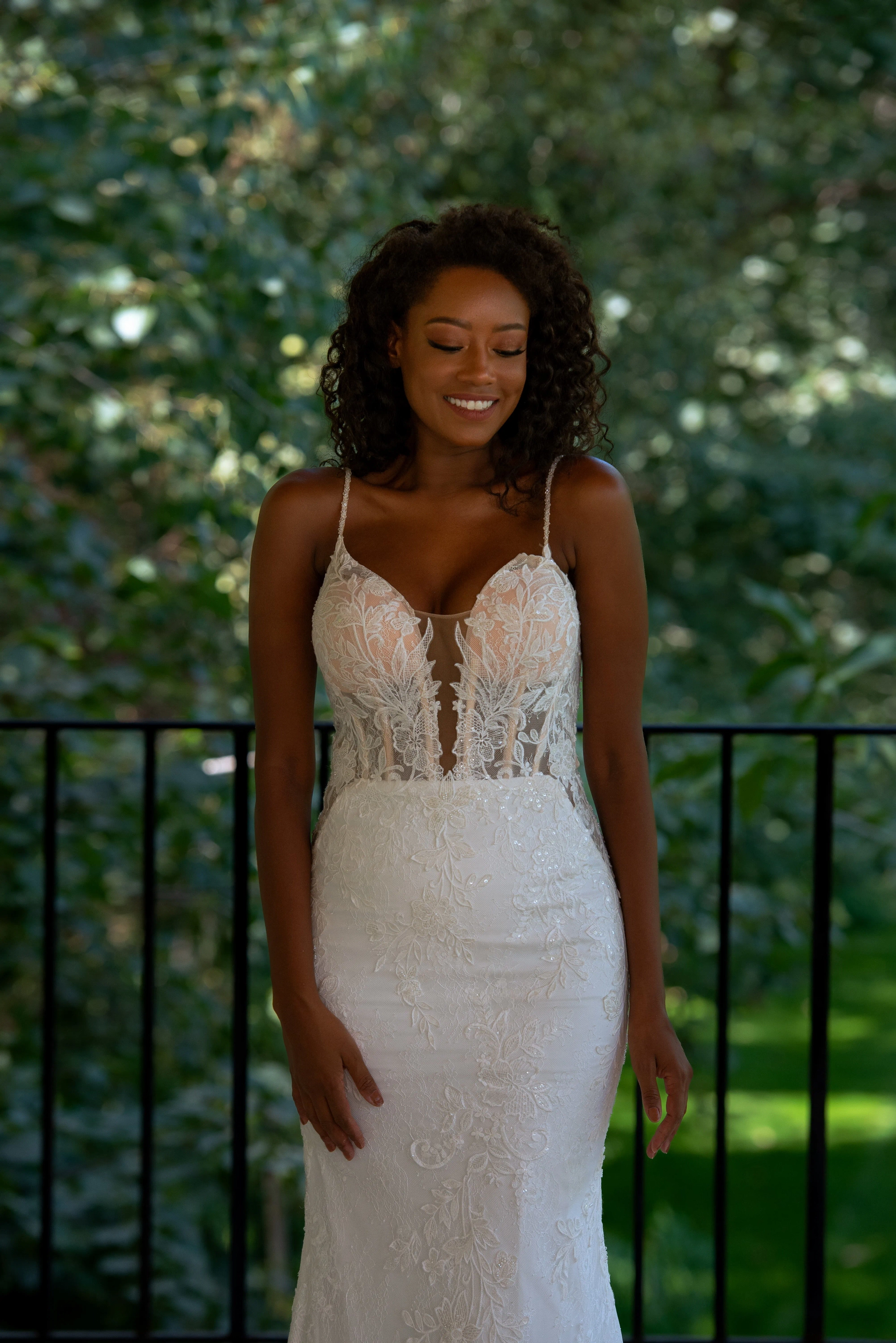 Marquette is bridal beauty from head to toe! The exquisite layers of Chantilly lace and appliqué make Marquette a go-to for the flirty and feminine bride. The plunging neckline is elongating, accenting the silhouette, with dainty iridescent crystal straps that elegantly face-frame so you stand out on your day. The low-cut rounded open back and striking side cut-outs photograph beautifully from every angle. The classic look of the Marquette is elevated with a dramatic length cathedral train. Soft yet bold, with eye-catching appliqué layered atop Chantilly lace, Marquette’s train is a dream come true. In Marquette, you’re sure to feel effortlessly you.